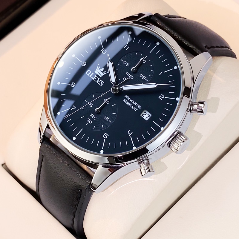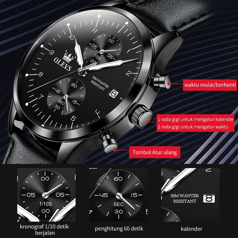 OLEVS Jam Tangan Pria Anti Air Original Kulit Tahan Keren Led Hitam Putih Terbaru Luxury Chronograph Watch Men Multifungsi