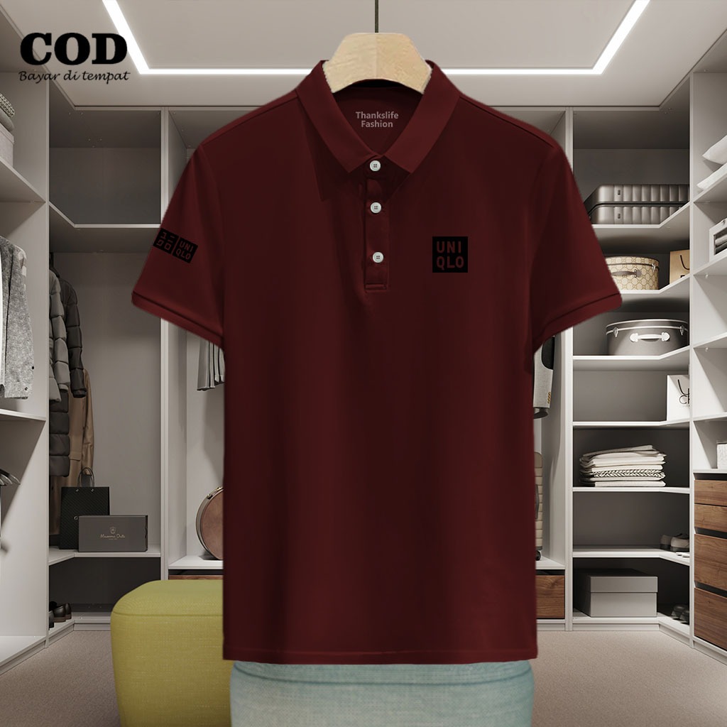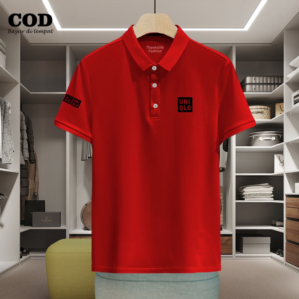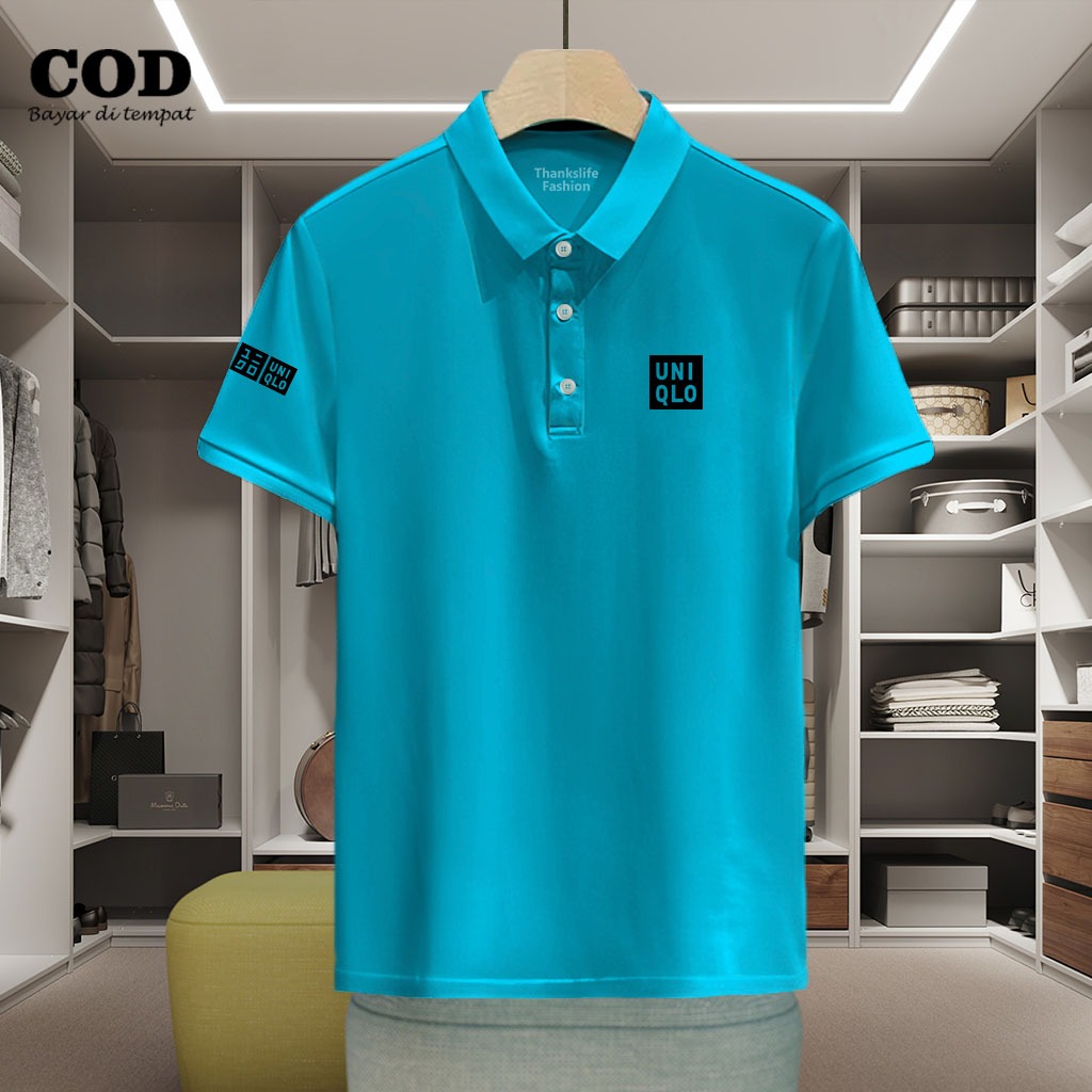 Baju Distro Style Polo Kerah Uniqlo + Lengan Text Hitam Kaos Polo T Shirt Denim Premium Quality Atasan Pria Wanita Promo