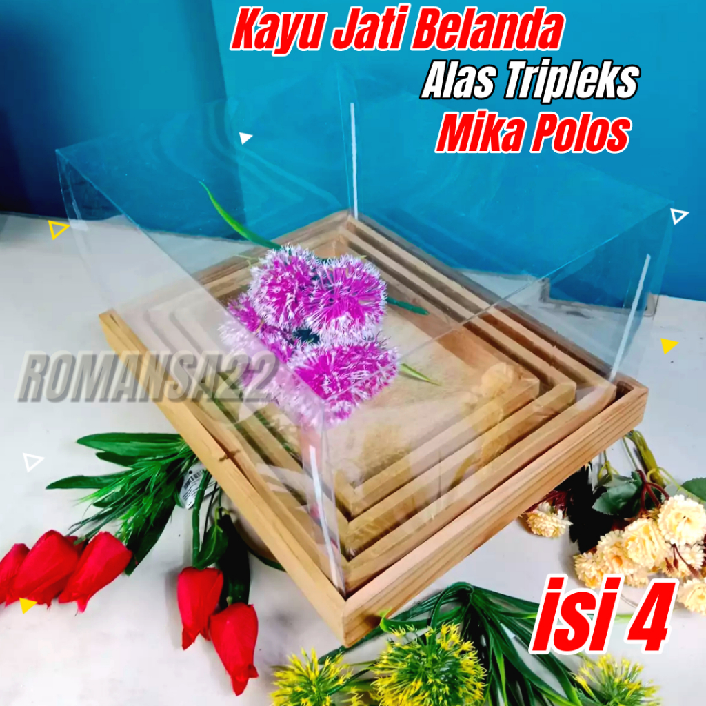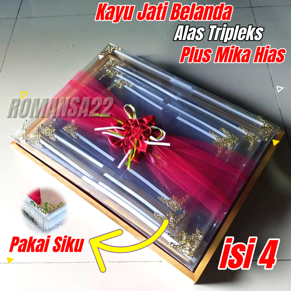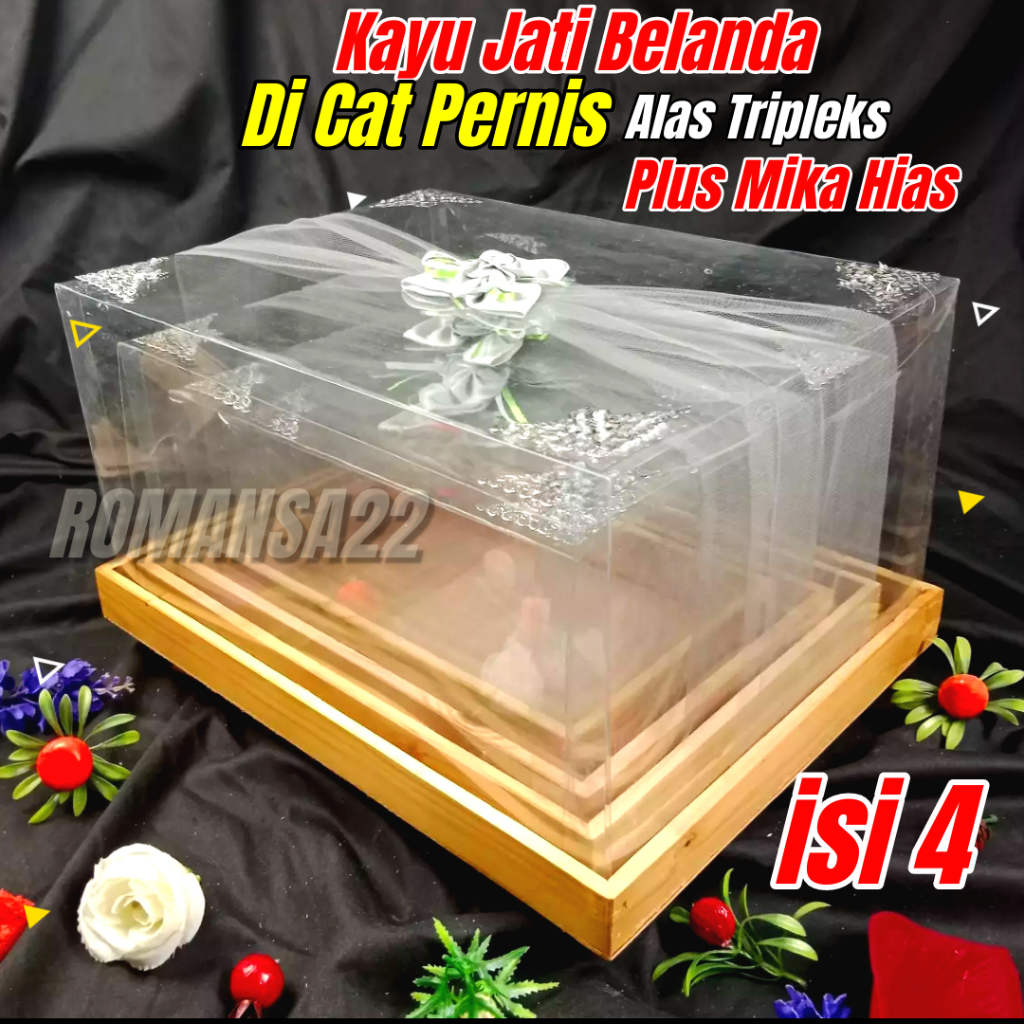 Box Seserahan KAYU JATI BELANDA Kotak Hantaran Pernikahan PLUS TUTUP MIKA HIAS KAIN TILE SATIN ISI 4