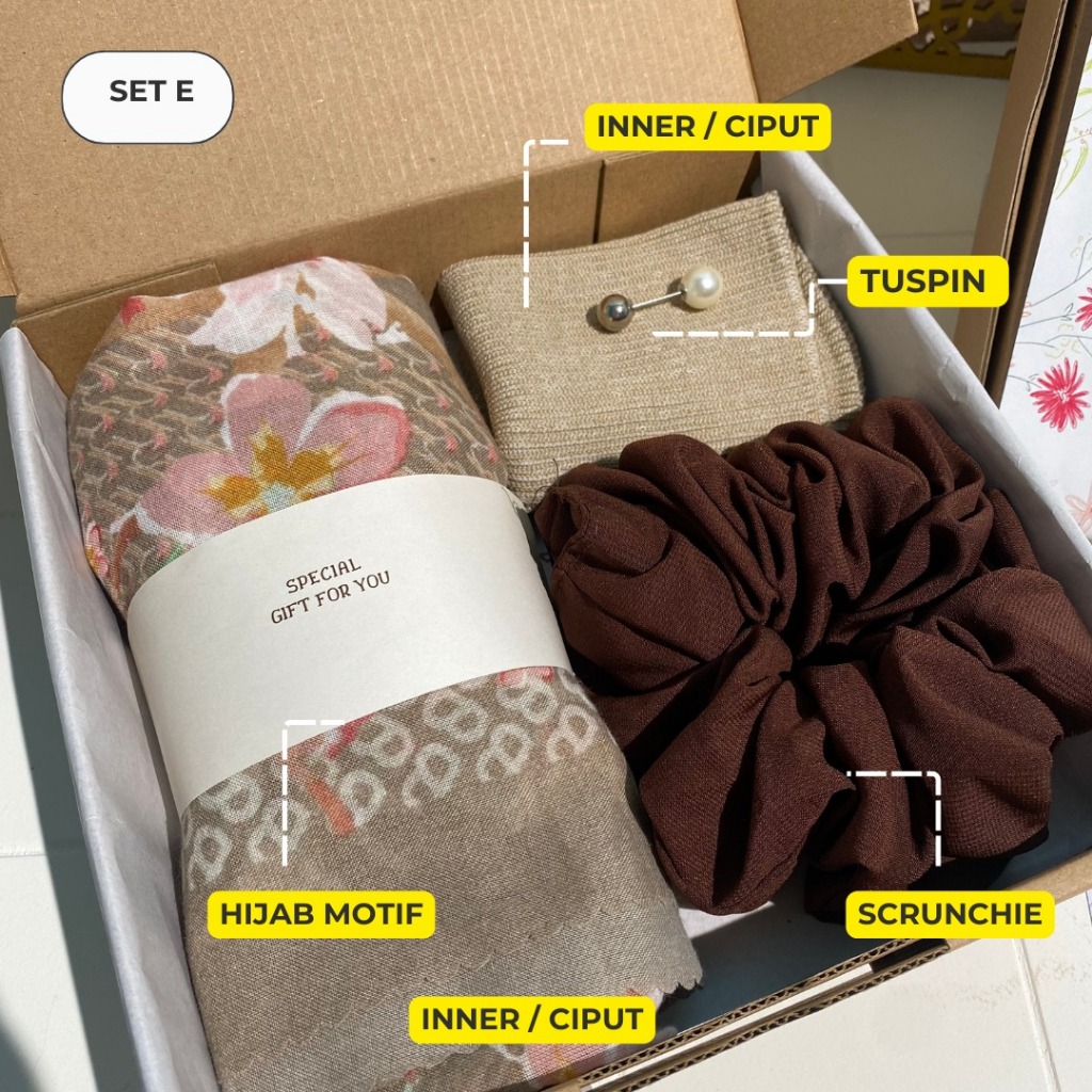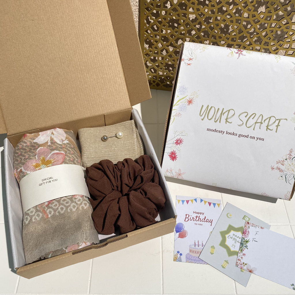 Hampers Hijab 4in1 Voal Segi Empat Premium Motif | Kado Hadiah Ulang Tahun, Nikahan, Lebaran, Wisuda, Anniversary, Guru