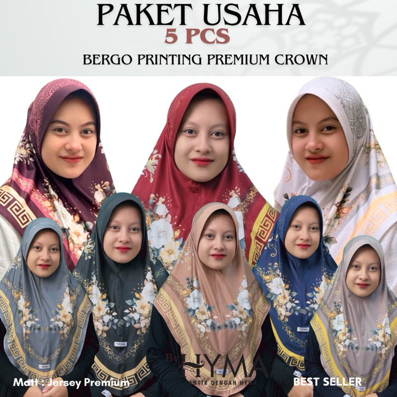 GLOSIR, PAKET HEMAT - PAKET USAHA 5 PCS Hyma Hijab Bergo Daily Motif Crown / Mahkota Printing Lembut Nyaman Panja