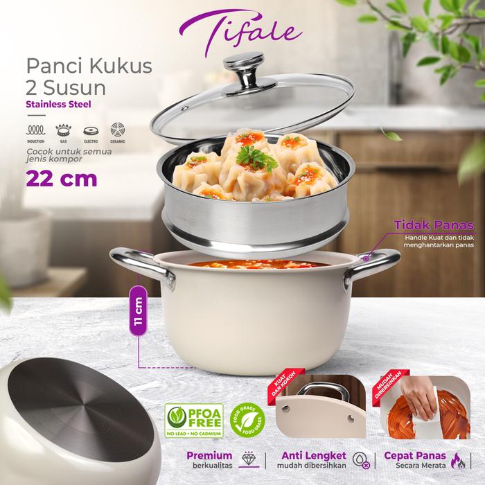 Terlaris Hongzhuo by Tifale Panci Kukus Sup 22CM 3L - 2 Tingkat Steamer Stainless Steel dengan Tutup Kaca - WHITE Elegan