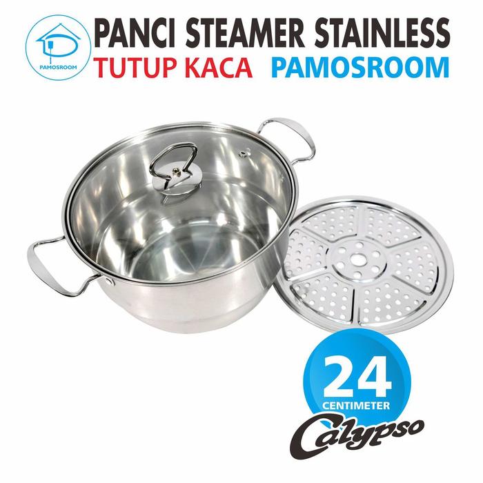 Terlaris Calypso Panci Steamer Stainless 24cm + Tutup Kaca Free Kukusan 24 Cm - Cls Steamer 24cm Keren