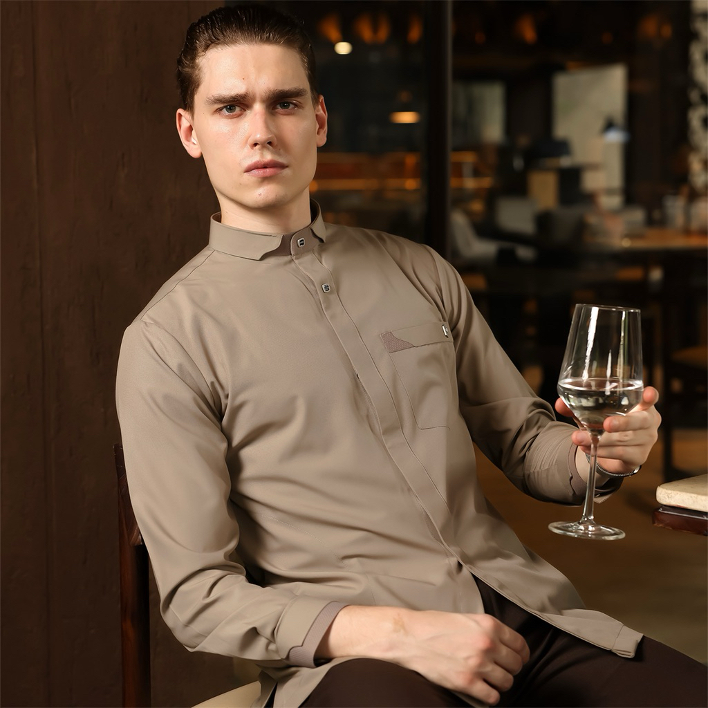 AZLAN Indonesia - Kemeja Koko Pria Shaheen Full Sleeve Milk Brown | Fashion Muslim Pria Kemeja Koko Lengan Panjang AZ14