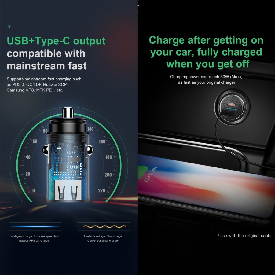 Car Charger Baseus 30W Type-C Pd+Usb Quick Charge 3.0 - Hitam