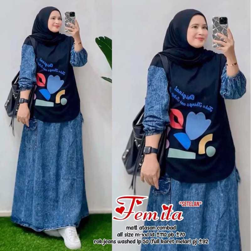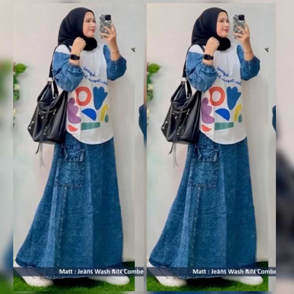 LOVILA SETROK , SETELAN UKURSN STANDAR & JUMBO , SETELAN ROK JEANS ARASAN COMBRT 24S, SETELAN KEKINIAN , TERBARU & BEST
