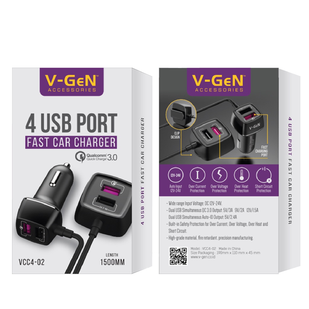 V-Gen Car Charger 2+2 Usb Port With Fast Charging Quick Charge 3.0 Mobil Vcc4-02