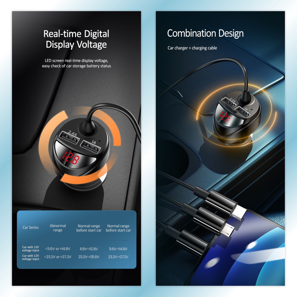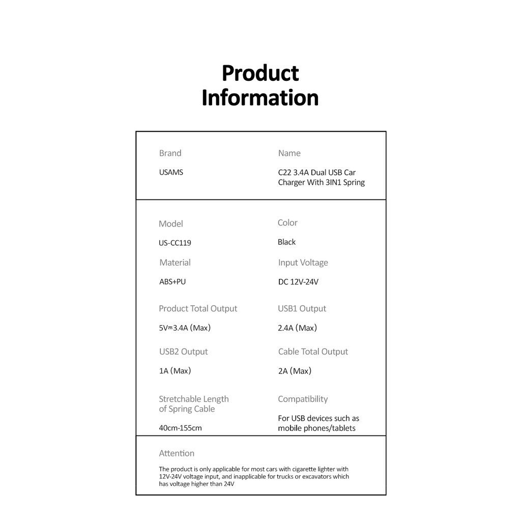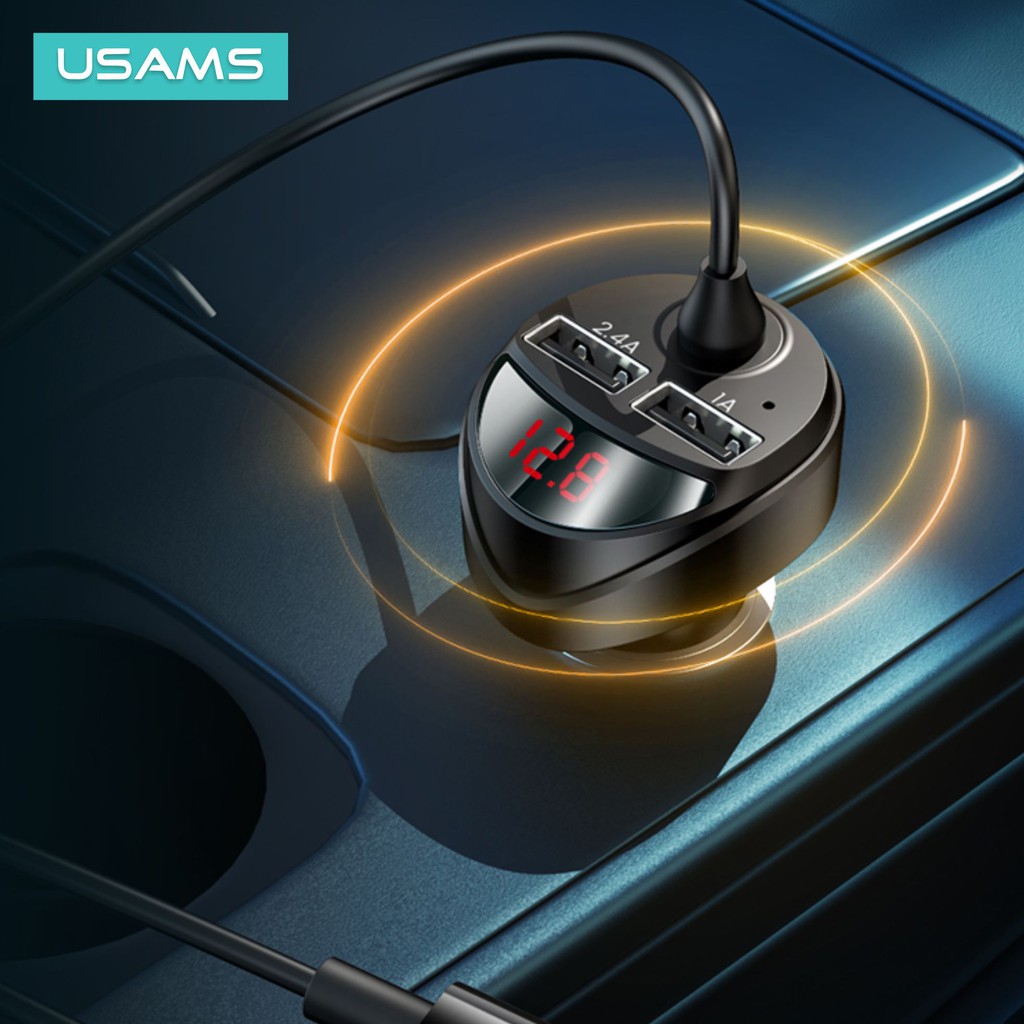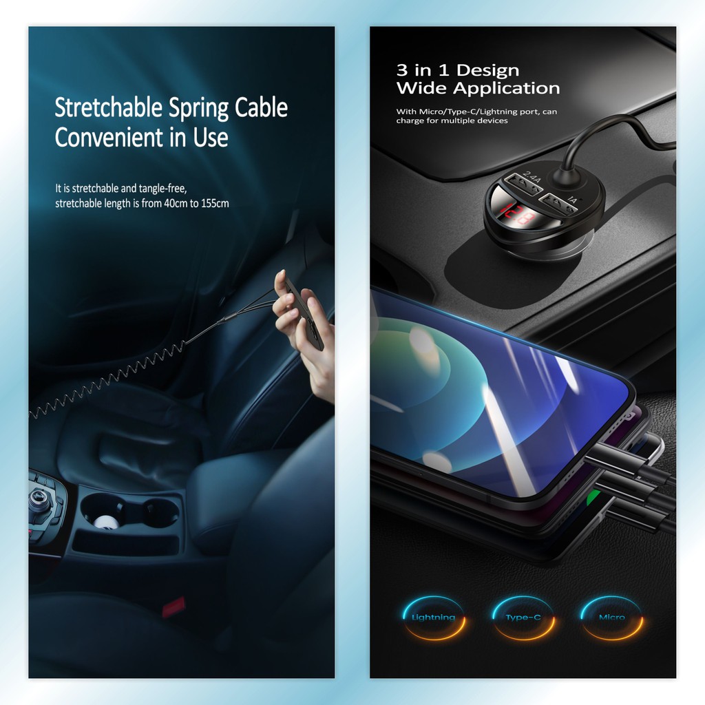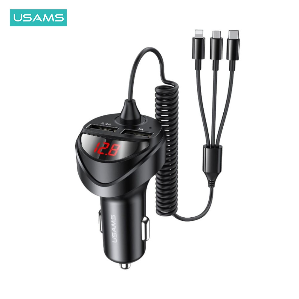 Usams C22 3.4A Dual Usb Car Charger With 3In1 Spring Cable