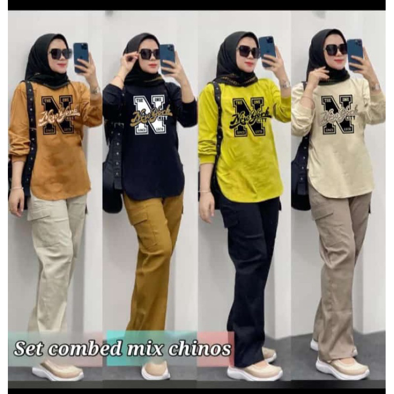 Setelan Chinos Wanita Dewasa, Atasan Combed 24s Celana Chinos Kulot Cargo, Setelan Wanita Terpopuler Terkini