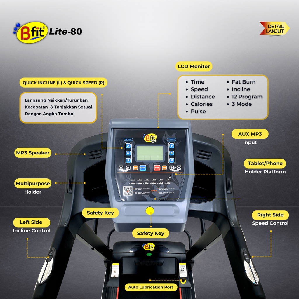 Treadmill Elektrik BFIT LITE-80 Auto Incline Multifungsi Listrik Lipat Portable Low Watt Fitness Gym