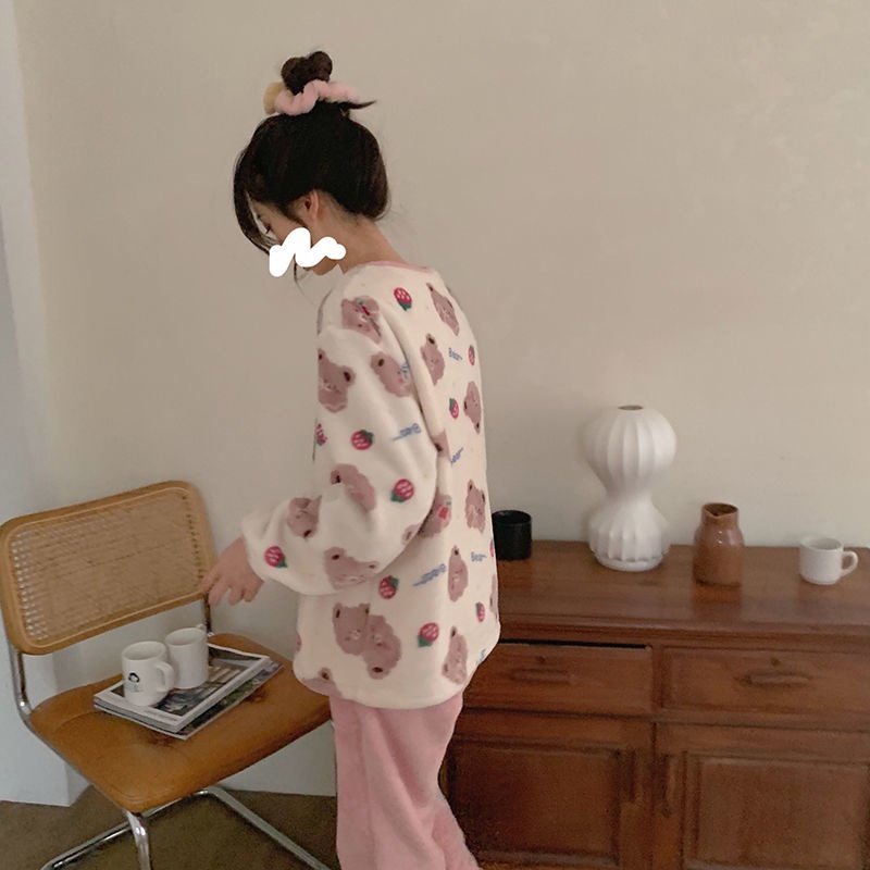 Prove Korea INS Piyama Wanita Musim Dingin Tebal Coral Fleece Musim Gugur Musim Dingin Strawberry Bear Flannel Pakaian
