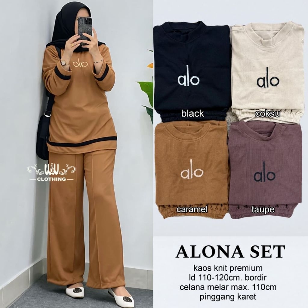 Setelan wanita trendy kekinian Alona set ori w&w clothing bahan kaos knit premium Ld110-120cm, celana pinggang karet