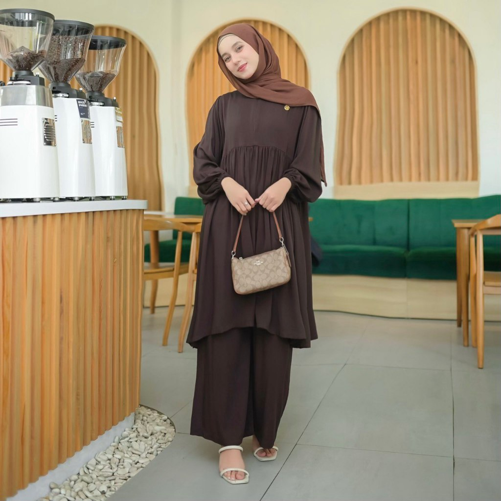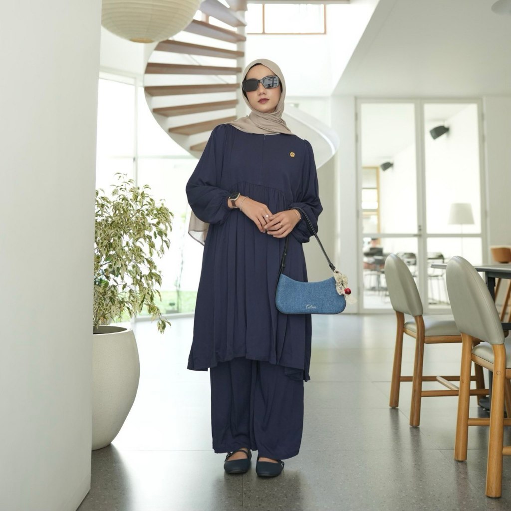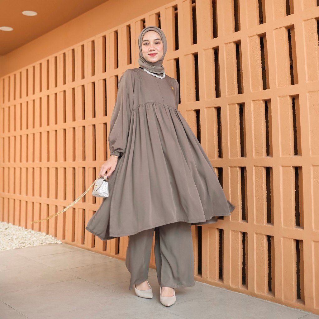 PROUDYHIJAB - Noora Setcel Setelan Atasan Tunik & Celana Bahan Rayon Premium Variasi Mini Ruffle Setelan Wanita Kekinian