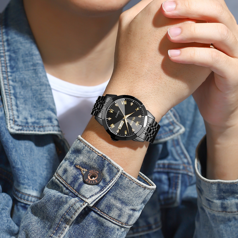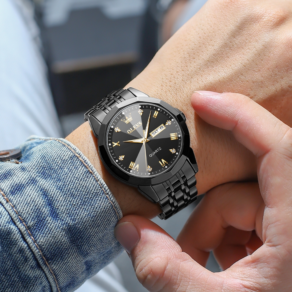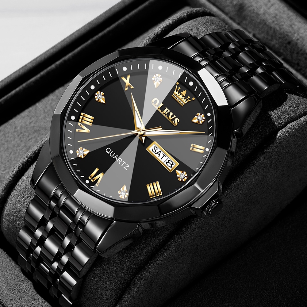 OLEVS Jam Tangan Pria Anti Air Original Cowok Kalender Bercahaya Analog Luminous Stainless Steel Hitam Biru Putih Men Watch Model 9931