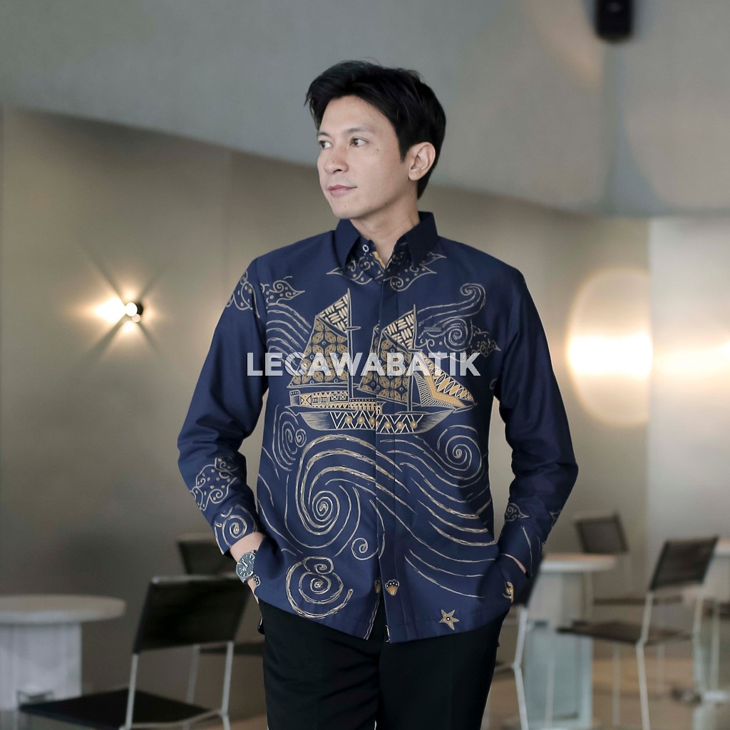 Legawabatik Kemeja Batik Pria Premium Jahitan Taylor Lapis Trikot Motif Kapal Pinisi Warna Navi