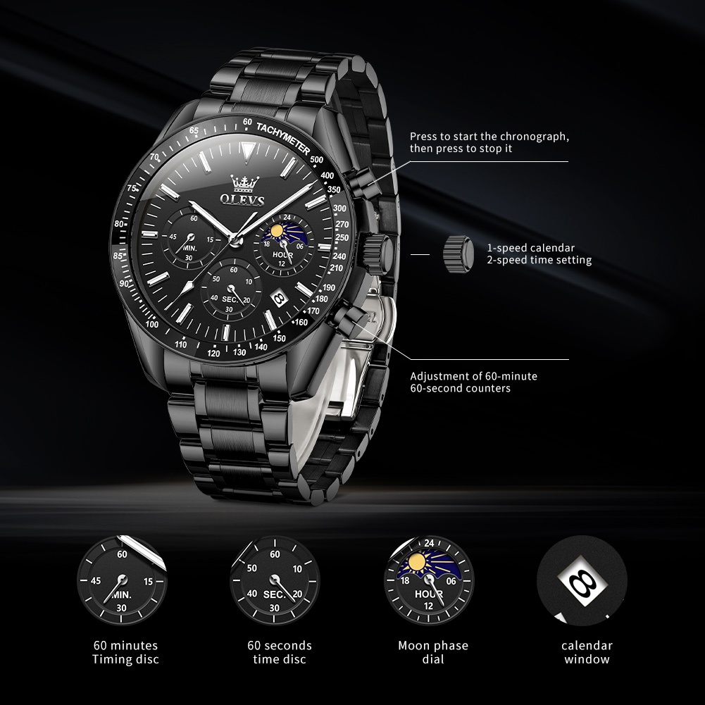 OLEVS Jam Tangan Pria Original Anti Air Tahan Hitam Led Sport Analog Chronograph Steel Watch Men