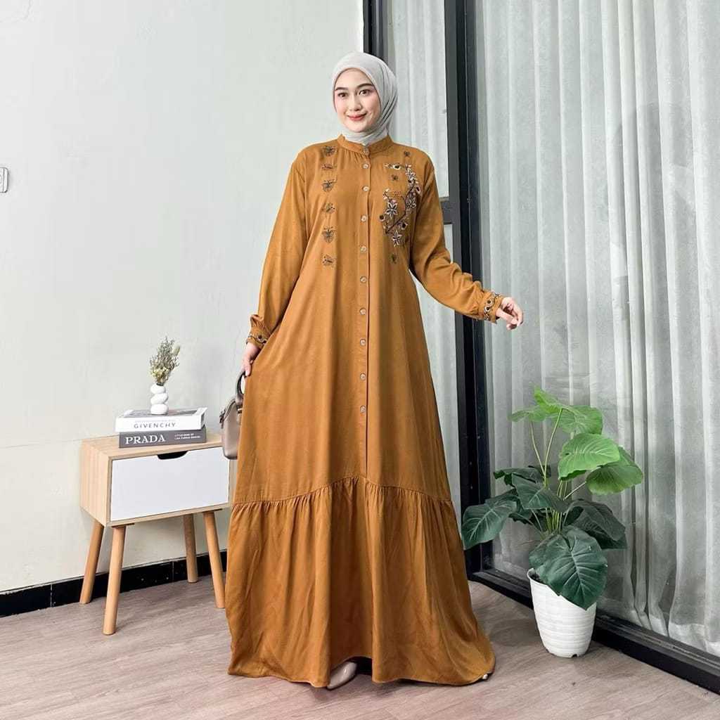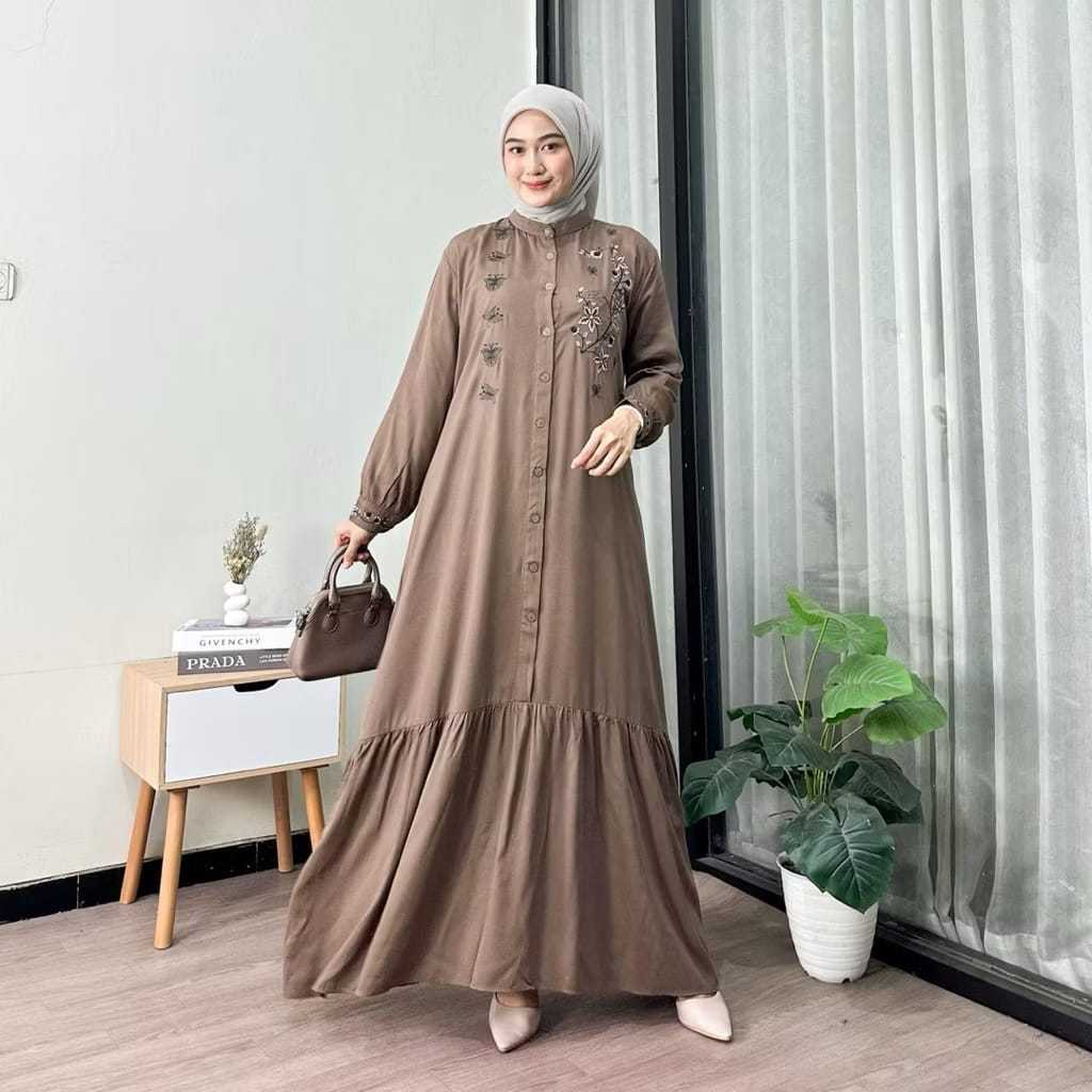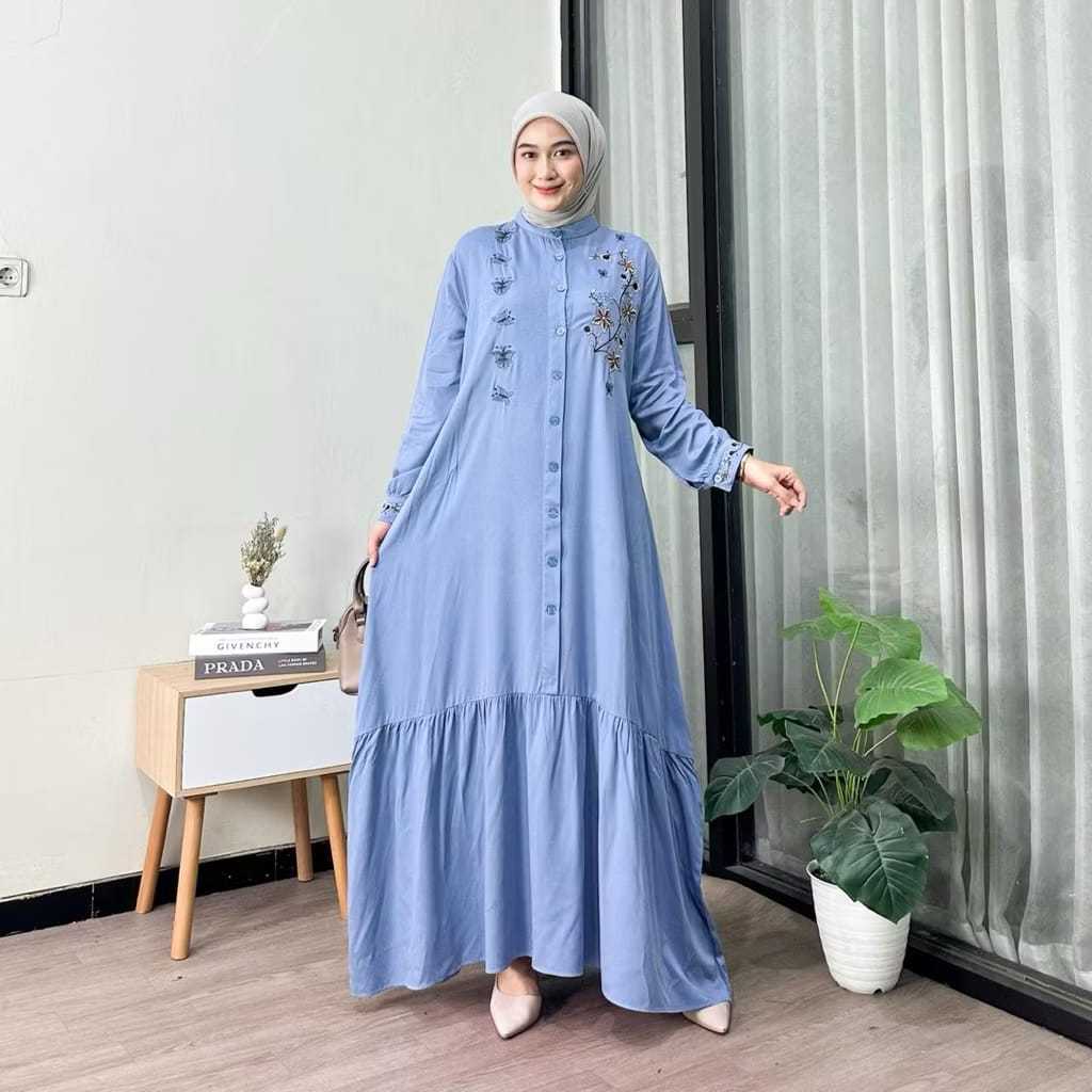 JAWARA - Moza Maxi Dress Muslim Wanita Bordir Gamis Rayon Twill Premium Full Kancing