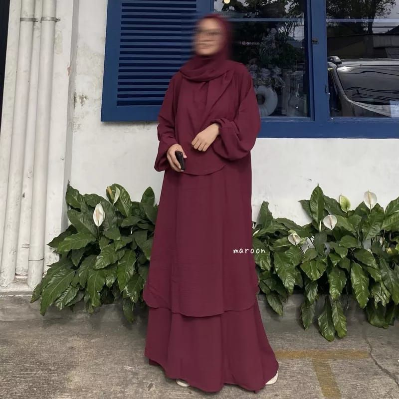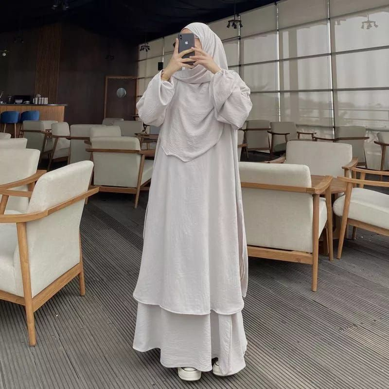 Hameda One set Rok Long Tunik Syari Baju Gamis Lebaran setelan Wanita Muslim Size Jumbo Bahan Crinkle Airflow Belah Resl