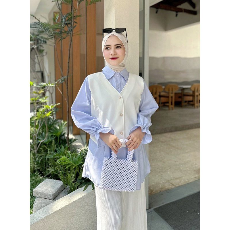 Kemeja Biru Azura Wanita Busui Muslim Kerja Casual Hits Kekinian Scuba Bonnie Navy Cloth