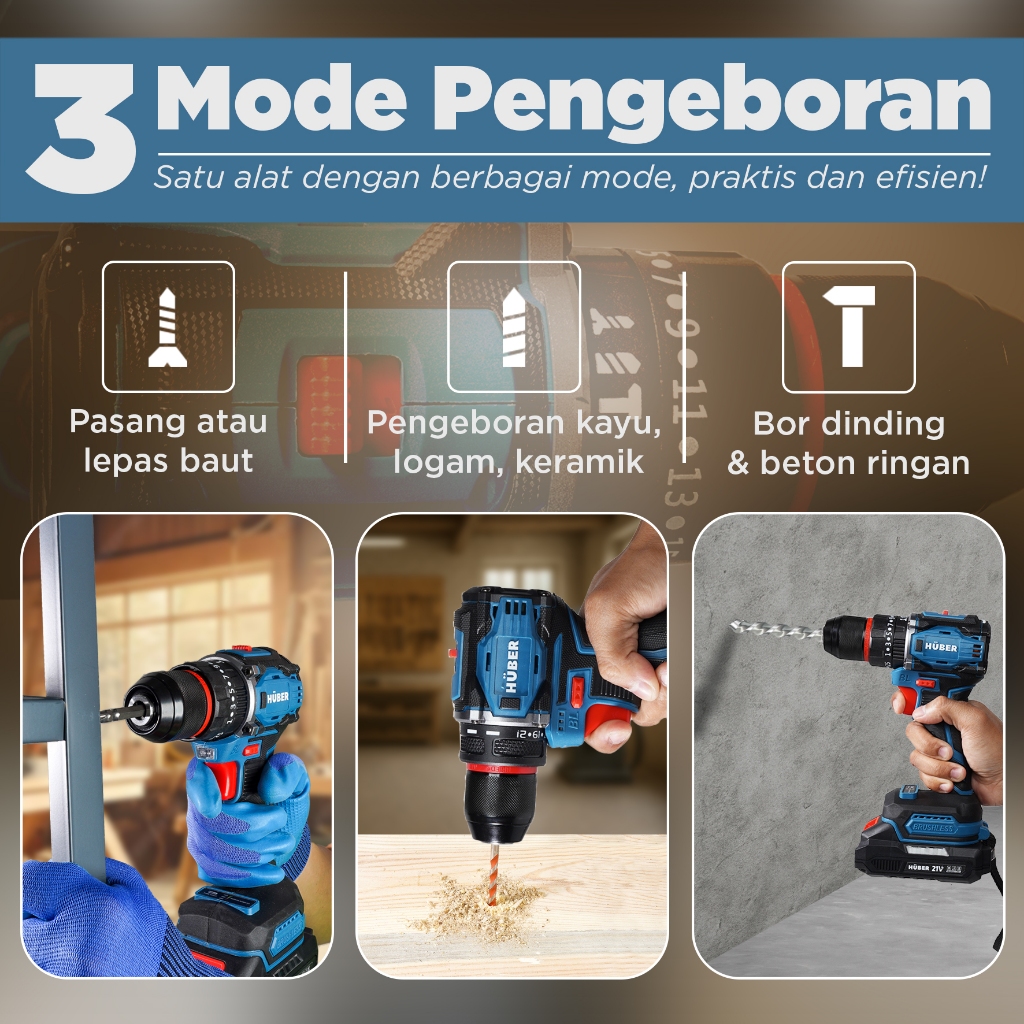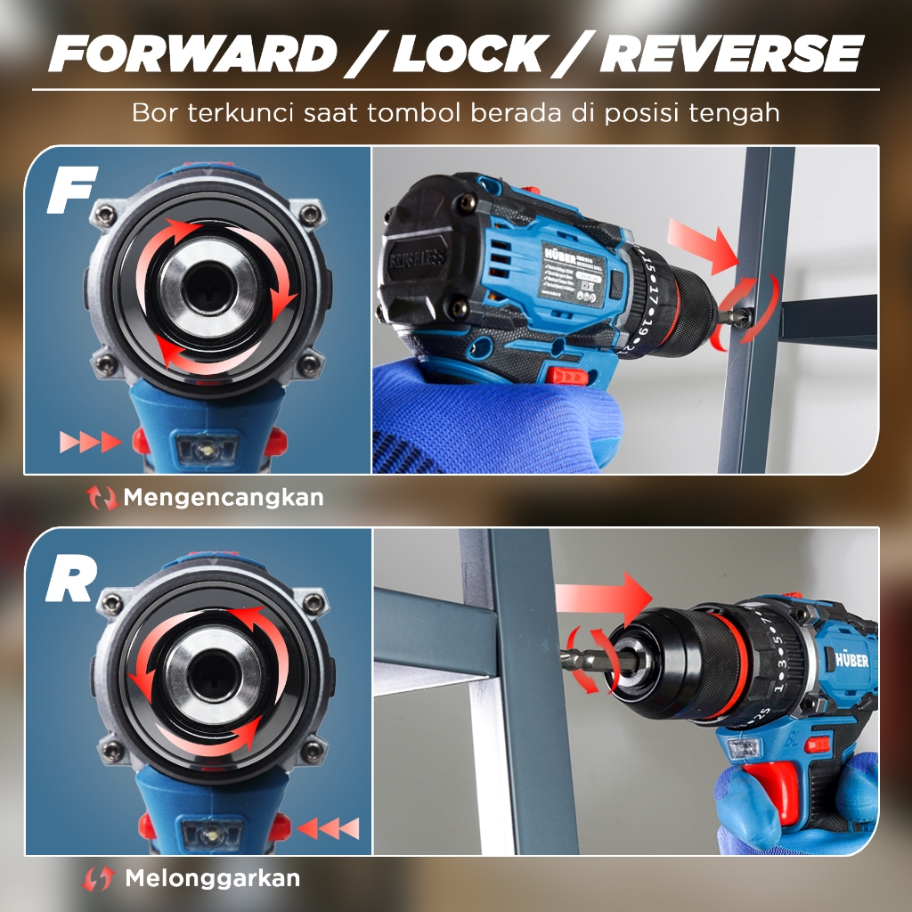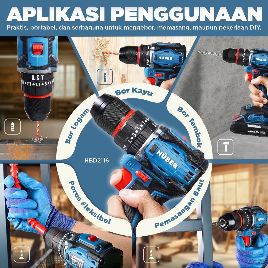 Huber Bor Tangan Listrik Brushless Cordless Drill Bor Portable Tanpa Kabel Bor Tembok Beton Kayu