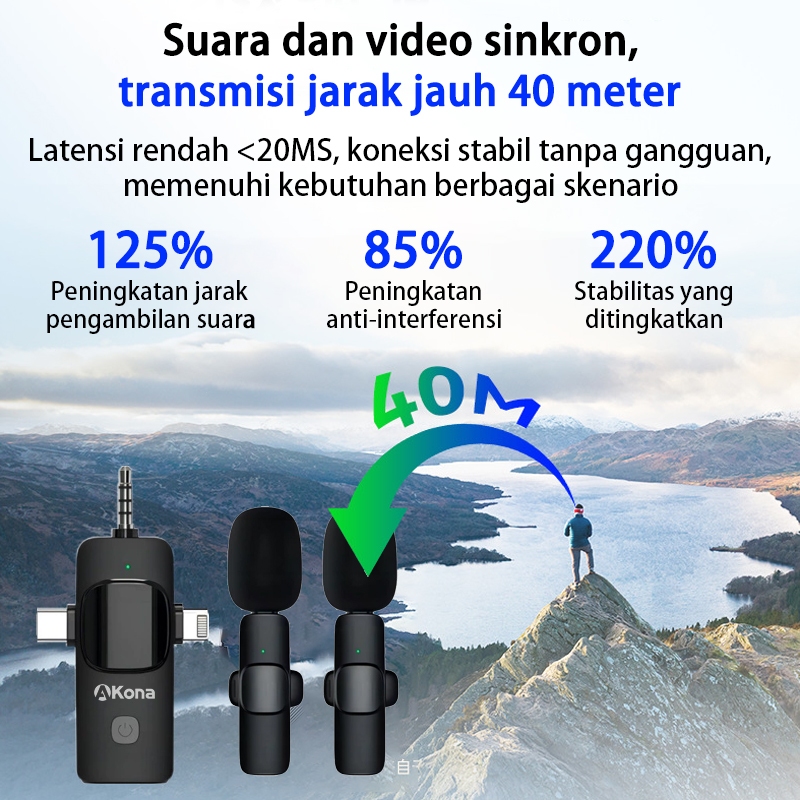 Akona 3 IN 1 Mic Wireless Clip On 2 Microphone Wireless Clip On Noise Reduction Mikrofon Konten Kreator 3.5MM Type-c Lightning For Hp / Kamera / Komputer