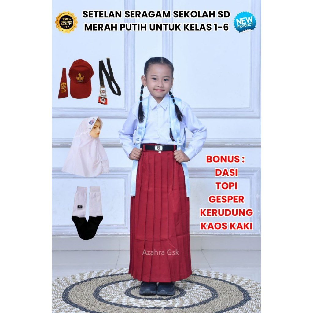Seragam Sekolah Sd Merah Putih Anak Perempuan Untuk Kelas 1-6 Bonus Kerudung Kaos Kaki Dasi Topi Gesper
