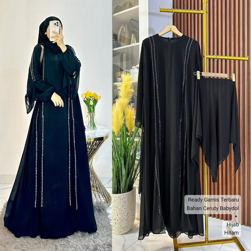 Luna Abaya Gamis+Hijab Bahan Ceruty Premium Mix Puring Variasi Payet Swarosky