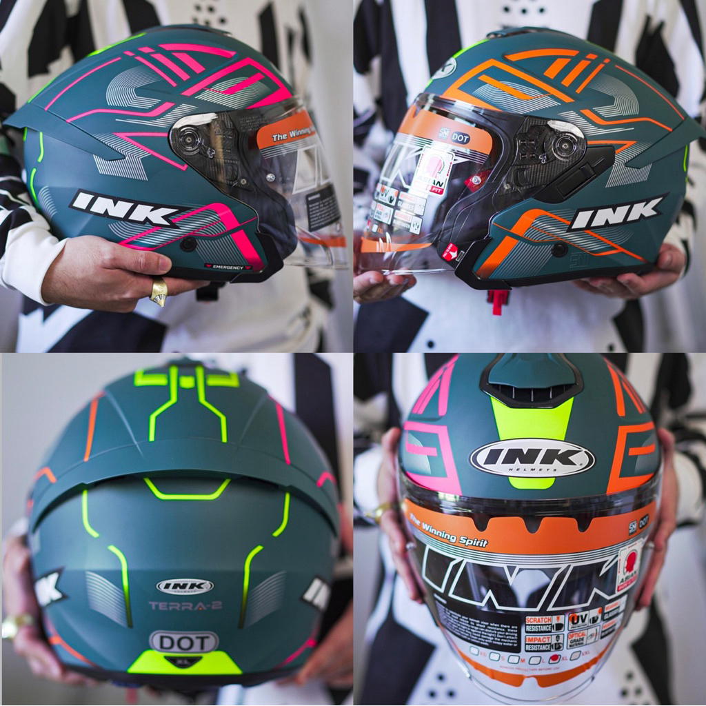 INK TERRA 2 #1 EMERALD GREEN FUXIA ORANGE DOFF ORIGINAL HELM HALF FACE DOUBLE VISOR ORI SNI