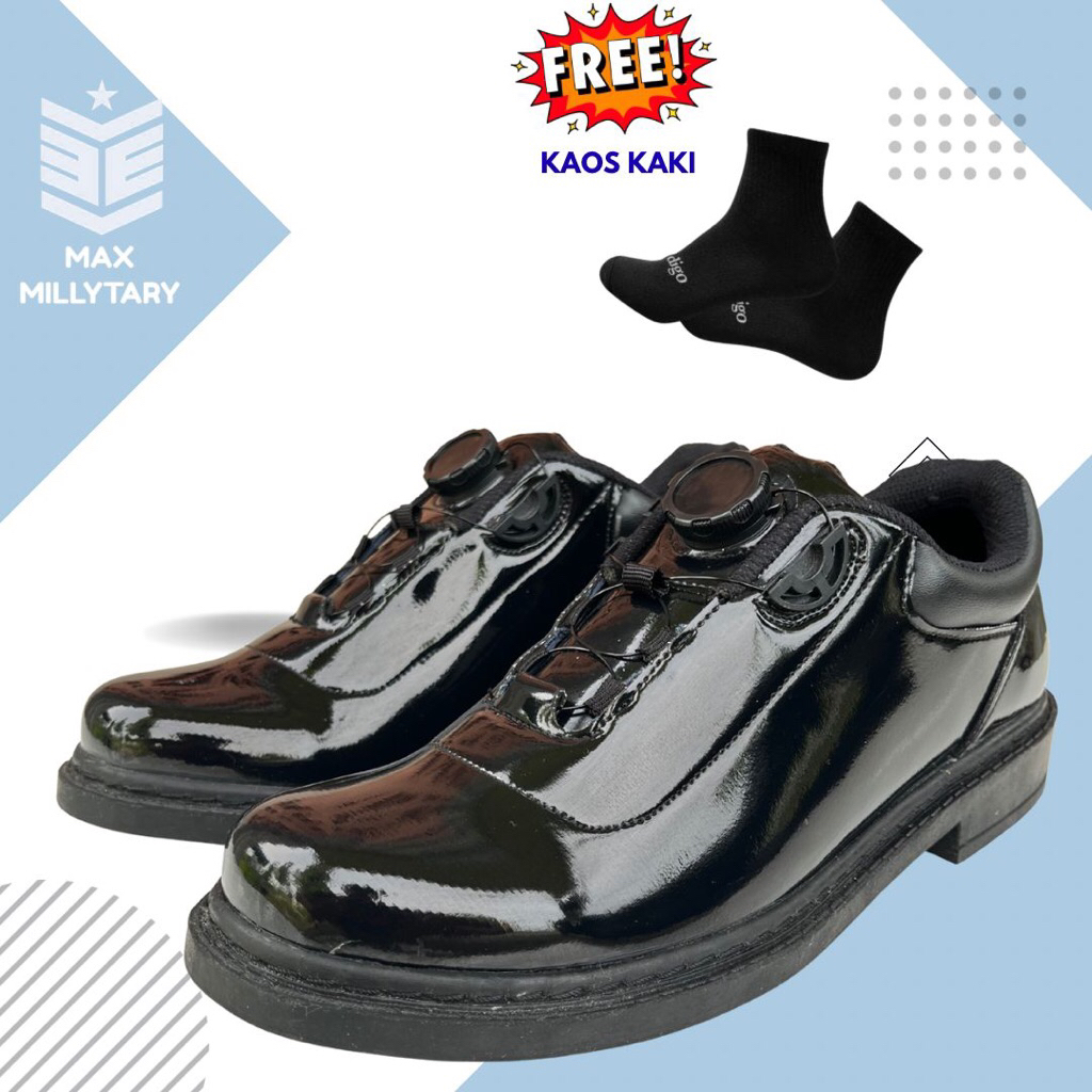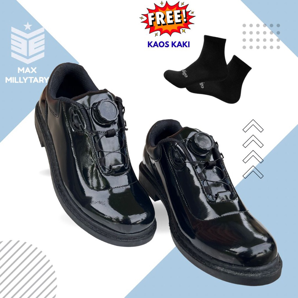FREE KAOS KAKI Sepatu PDH Pria MAX MILLYTARY – Formal Hitam Kilap Model BOA Tali Putar, Nyaman & Kuat – GRATIS ONGKIR