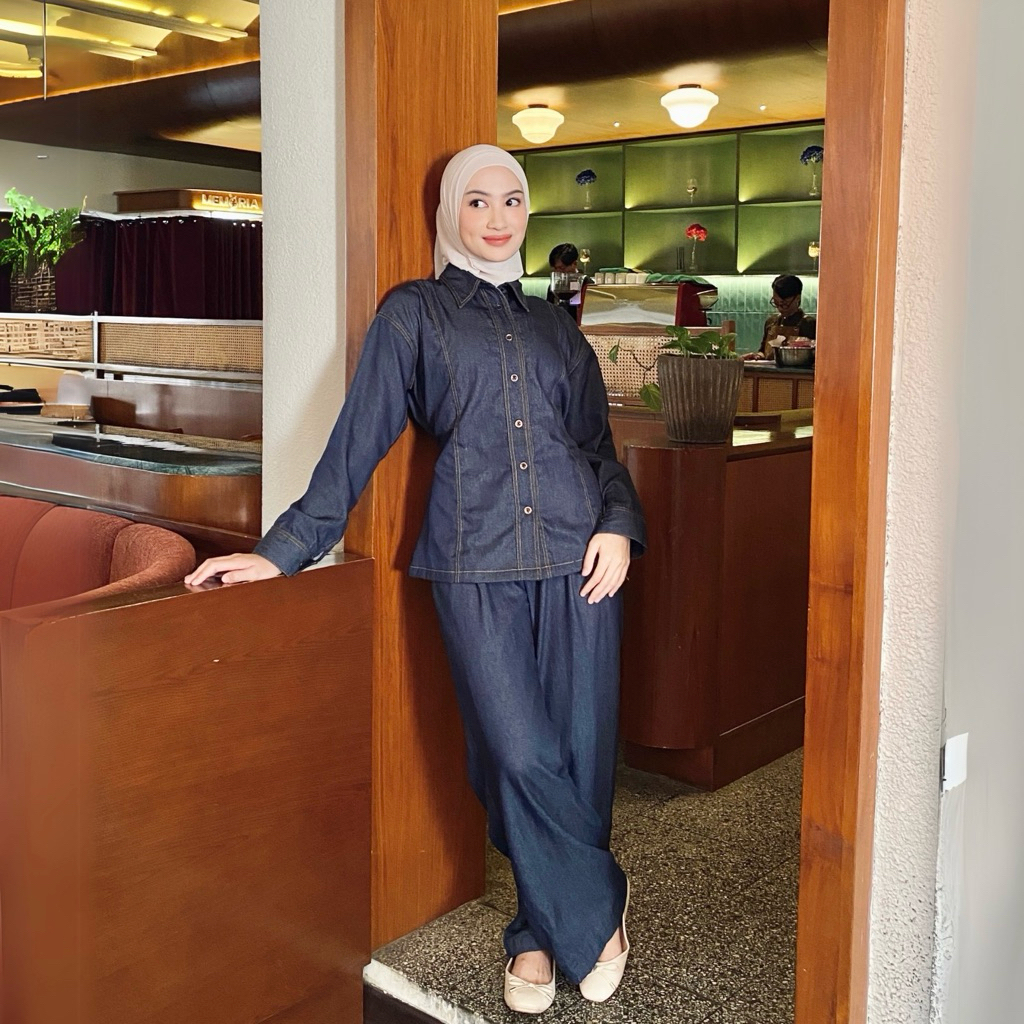 MORU KEIN - SORA ONE SET atasan denim wanita kemeja cewek fit body celana panjang cullote jeans
