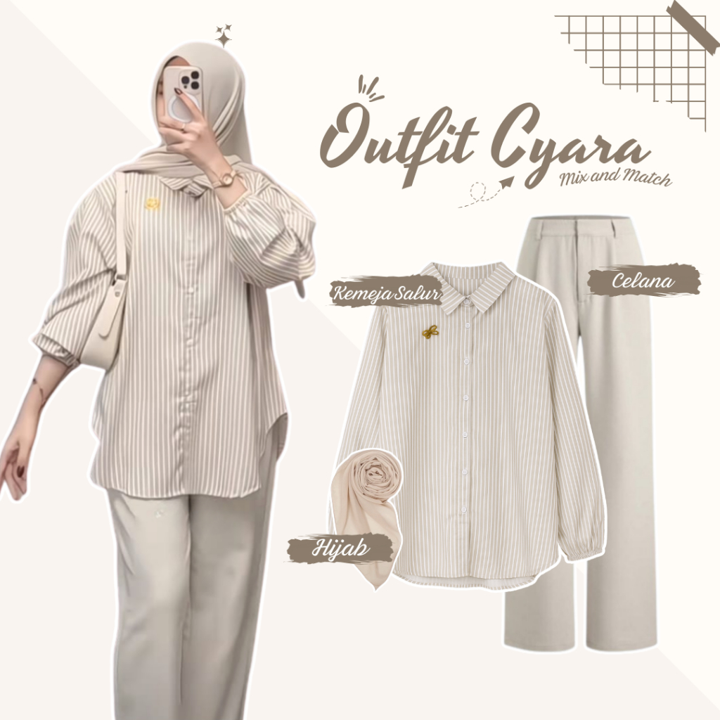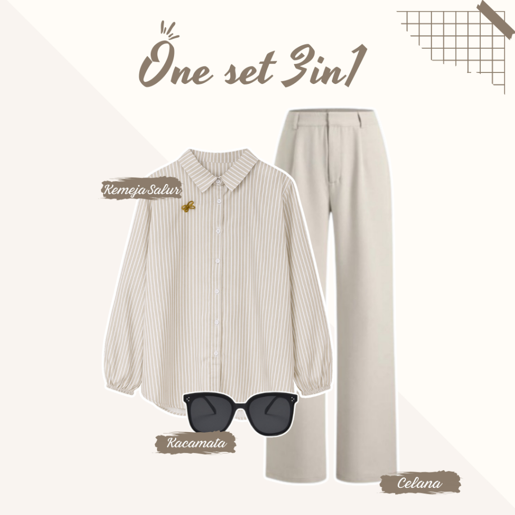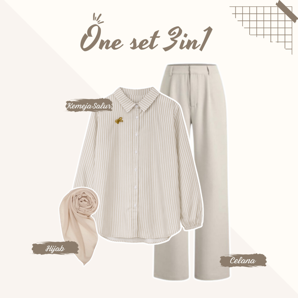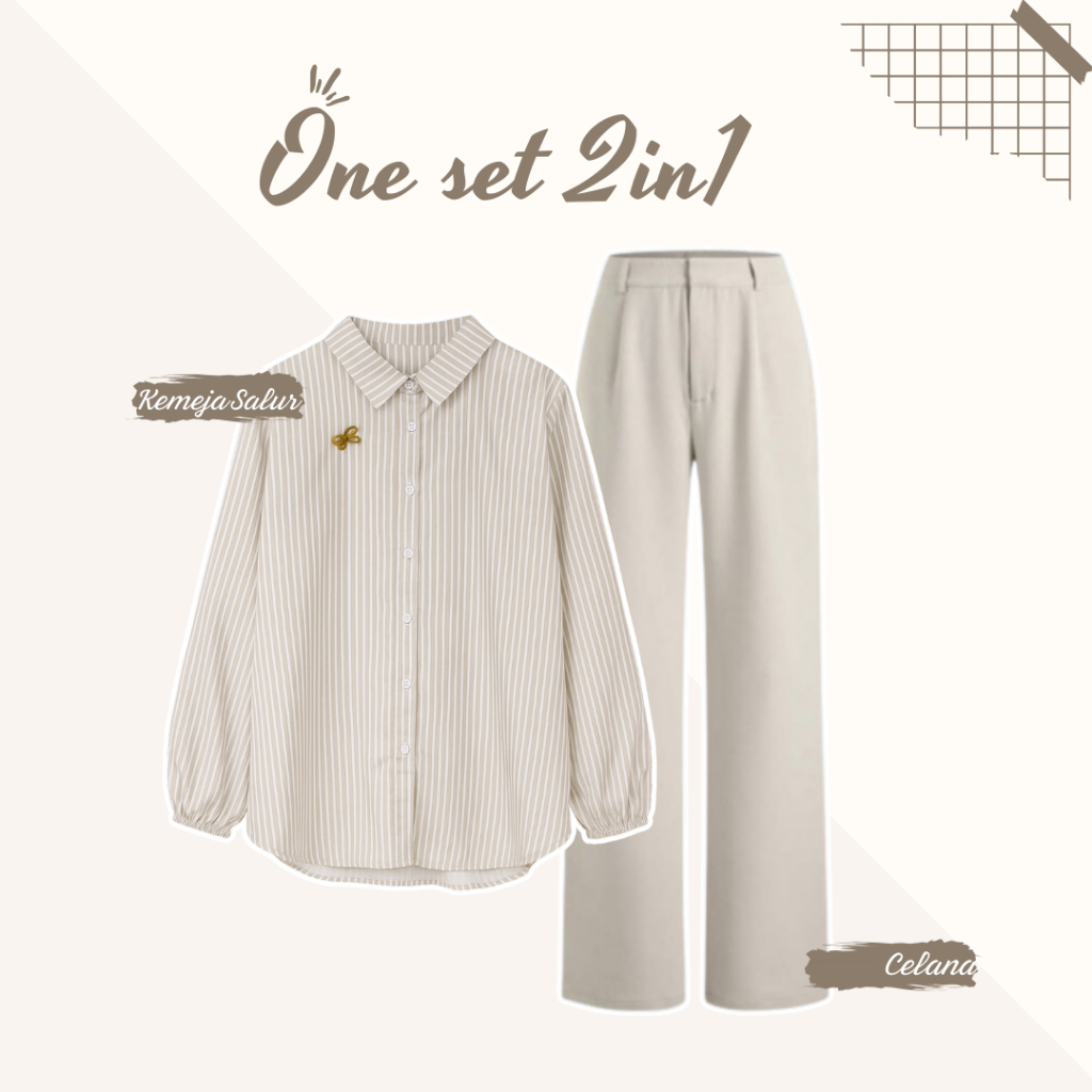 Setelan Wanita Bangkok Style One set ( Blouse kemeja salur Cream + Celana Hightwaist Hijab ) AM210N