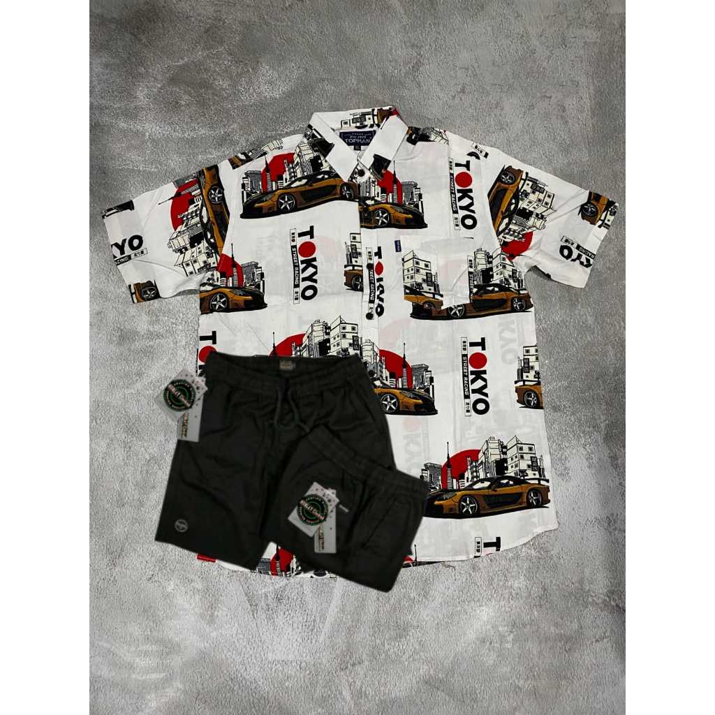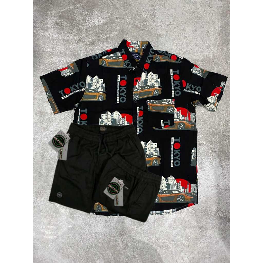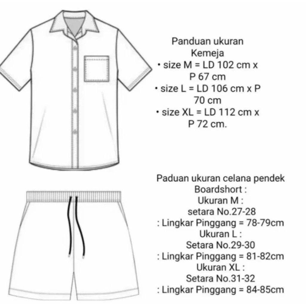 One Set Setelan Kemeja Motif Pria Lengan Pendek Dan Celana pendek Boardshot Katun Original Kekinian