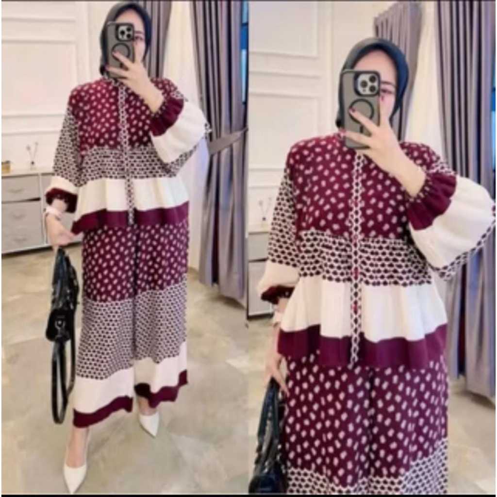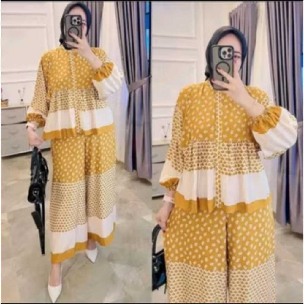 BIG SALE 3 Pcs 100Rb Setelan Rayon Wanita Motif Polka Oneset Baju Blouse & Celana Kulot Kekinian