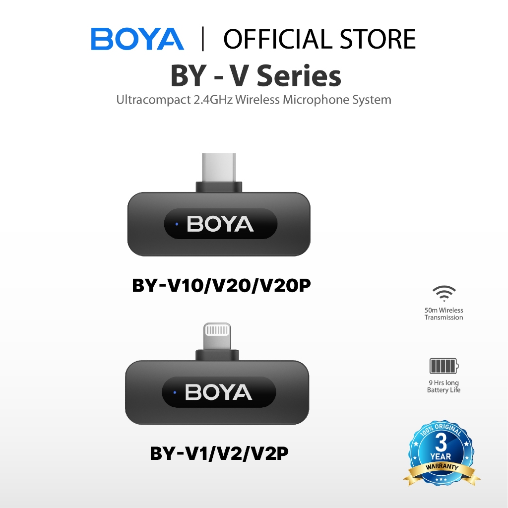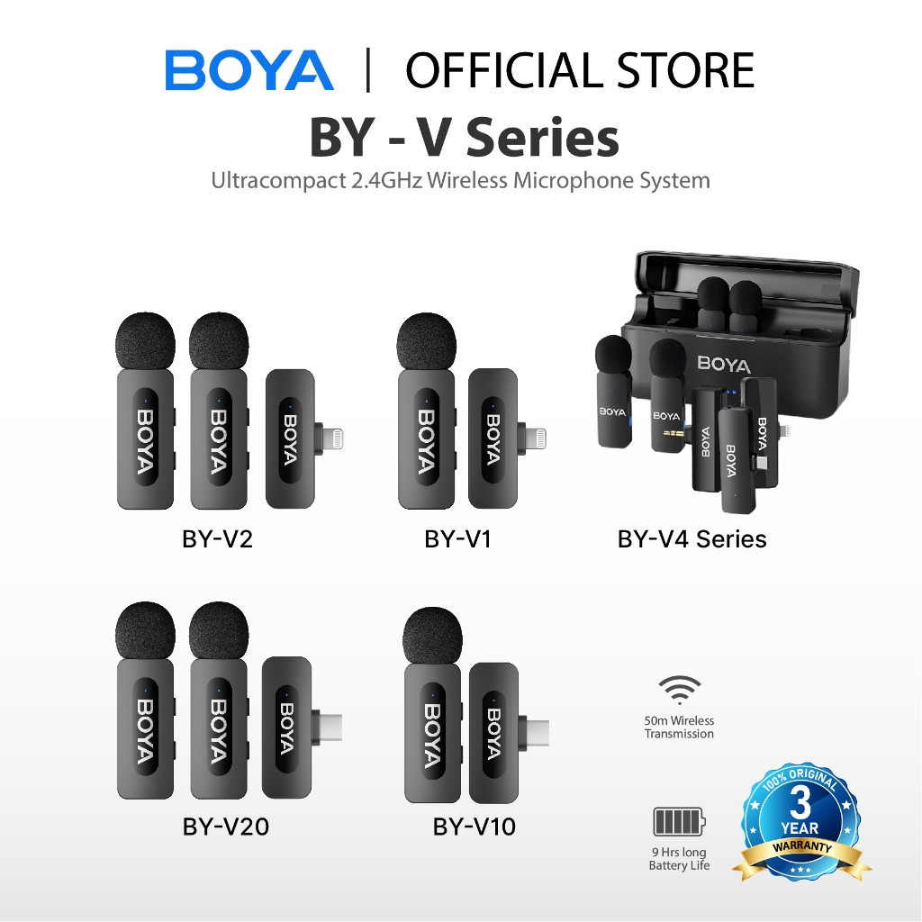 BOYA BY-V1/V2 BY-V10/V20 BY-V4/V4U/V4D Sistem Mikrofon Clip On Nirkabel Ultracompact 2.4GHz Wireless Microphone dengan Port Lightning iOS untuk Siaran Langsung Ponsel Pintar