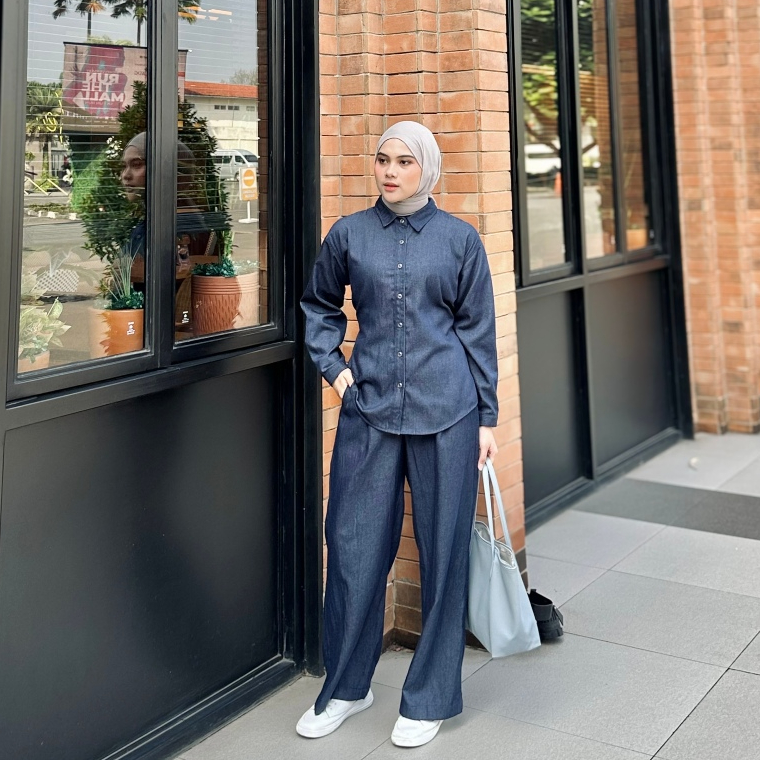MORU KEIN - NARA Set setelan wanita atasan denim kemeja oversize fit body celana panjang jeans