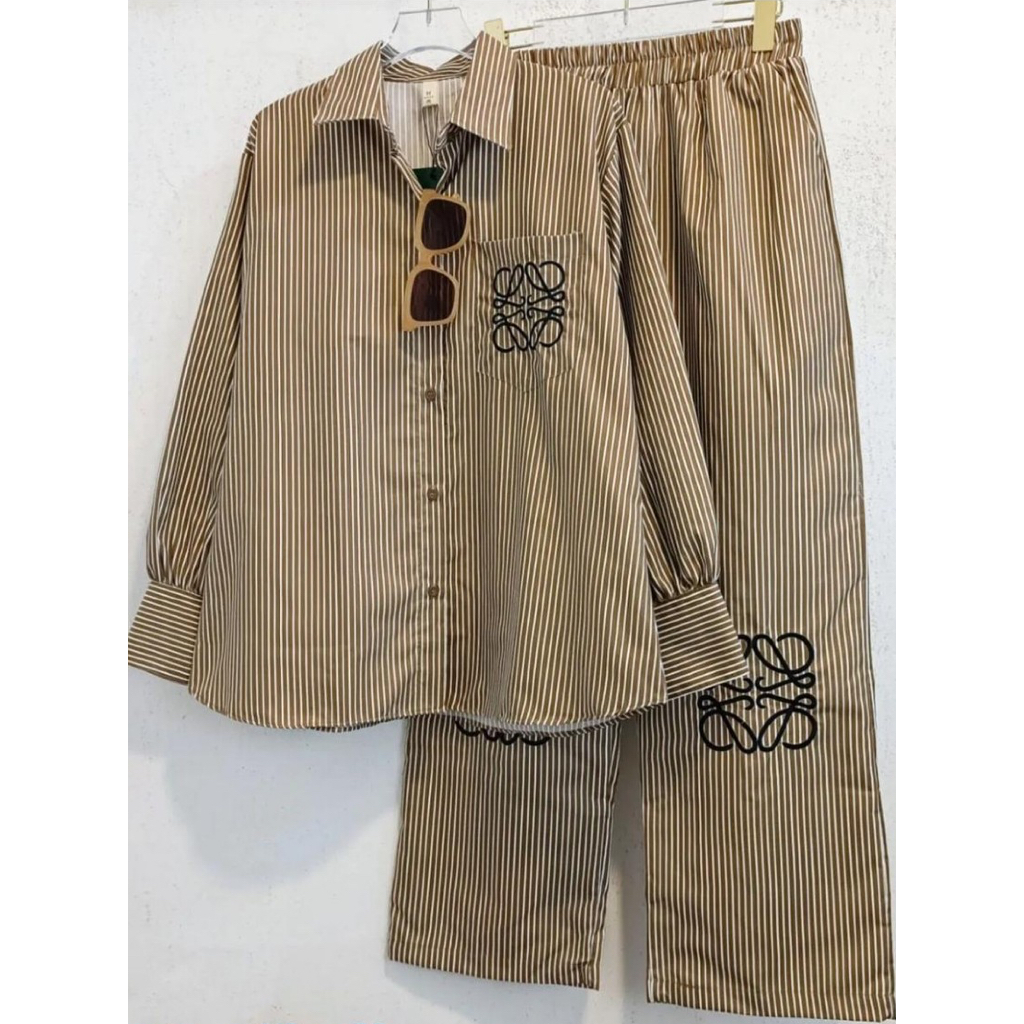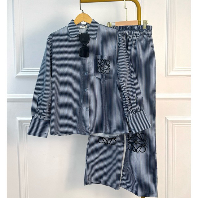 RYUJIN SET | One Set Stripe Kemeja Wanita Lengan Panjang Motif Bunga + Celana Bahan Katun Premium