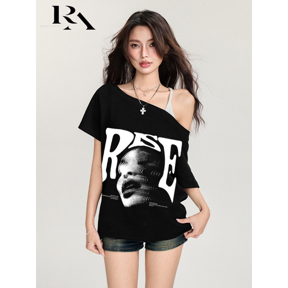 RIOD AOER baju atasan wanita terbaru Amerika Y2K Pola trendi putih cetak kaos lengan pendek wanita retro streer vintage ahs style stockholm