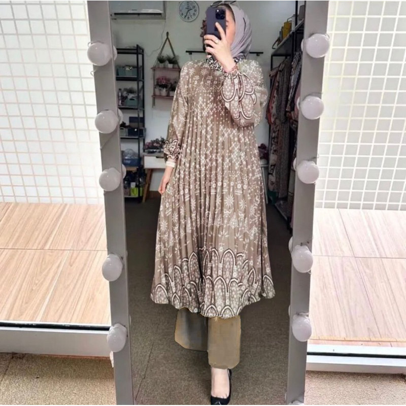 Setelan Khanza Plisket Etnic Oneset Midi Long Tunik Silk Celana Cringkle Premium Busui Freindly Jumbo