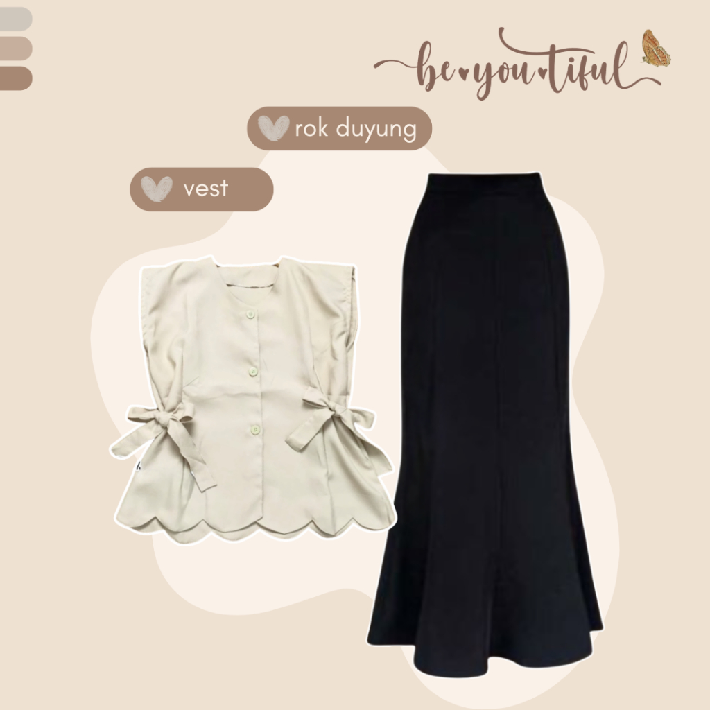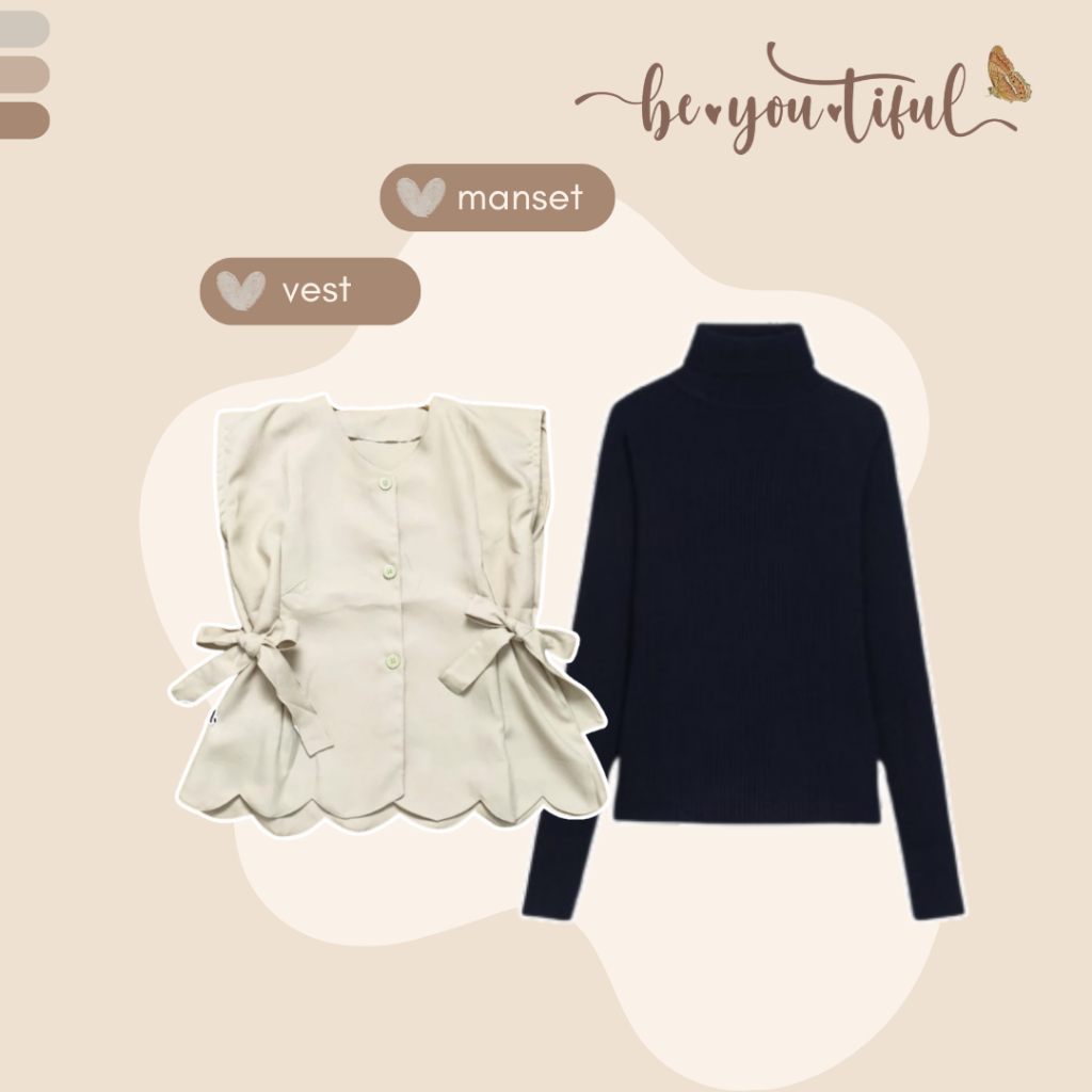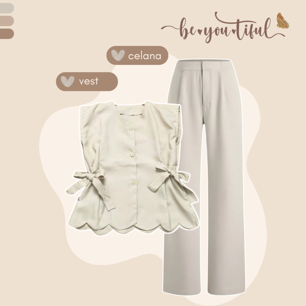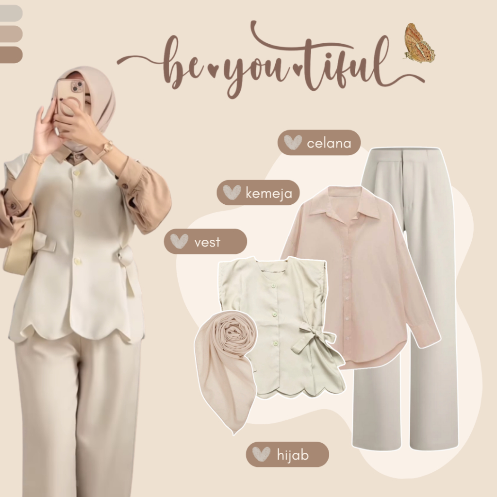 1Set 4in1 OOTD Wanita | Vest Cream + Kemeja + Celana Loose Pants + Hijab | Outfit Kekinian - AM24N