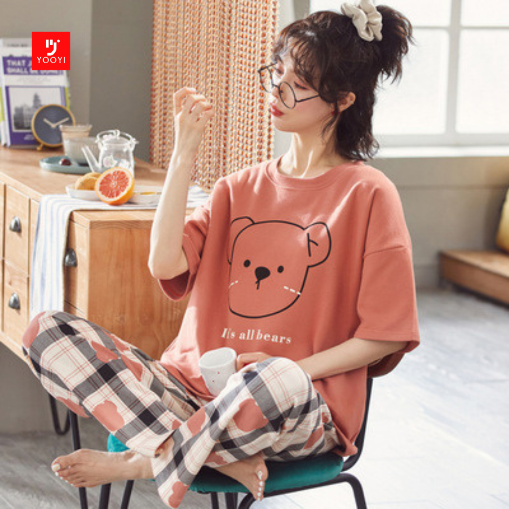 Yooyi Baju Tidur Wanita Piyama Korea Lengan Pendek Celana Panjang Motif Kartun Lucu Setelan Tidur Murah Model Kaos Korea