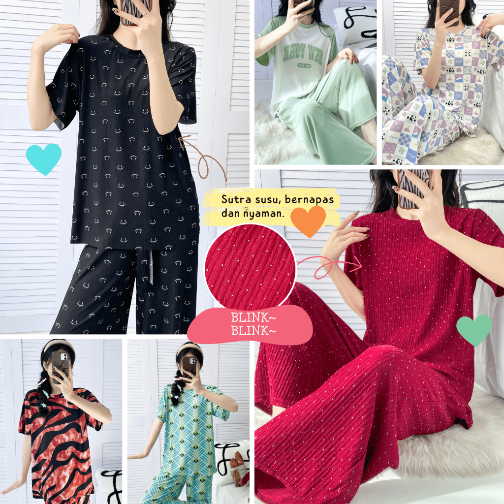 Q&L Piyama Set Wanita Baju Tidur Lengan Pendek Celana Panjang Motif Kartun Lucu Sutra Susu Premium