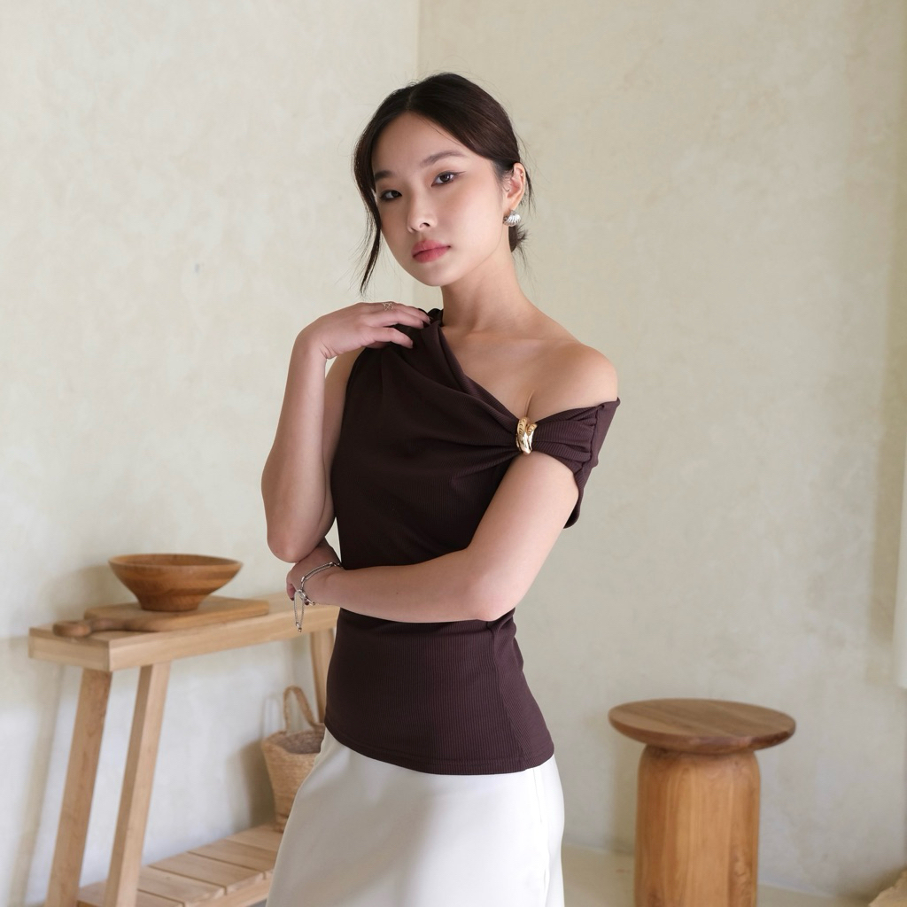 BAECHIC.CO - Elea Top Atasan Wanita Off Shoulder Sabrina Knit Twist Top Fitbody Stretch Elegan