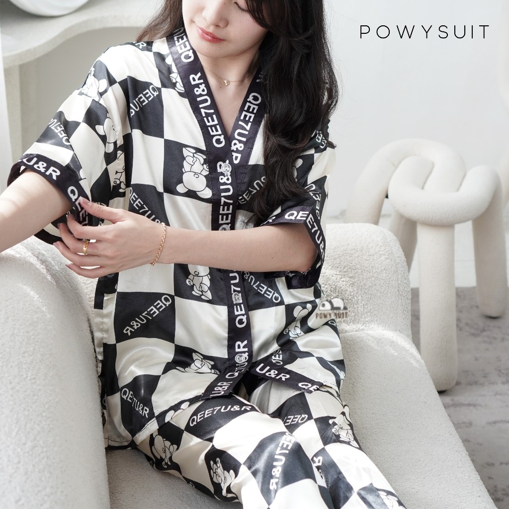 ST Powysuit Piyama V neck Motif Powysuit Satin Lengan Pendek Celana Panjang Baju Tidur Wanita