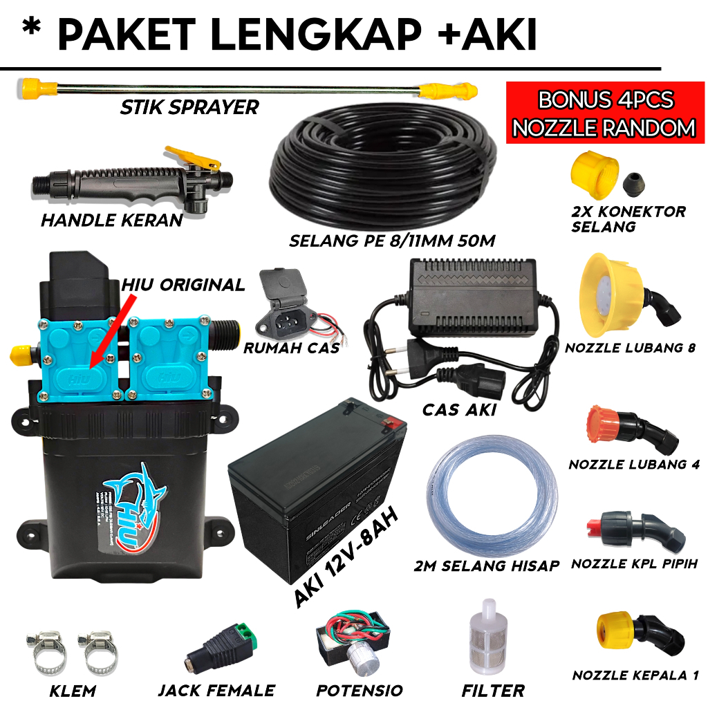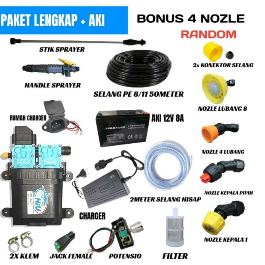 Paket Sprayer Pertanian Dobel Pompa Hiu+Aki 12V Selang 50Meter Atau 100Meter
