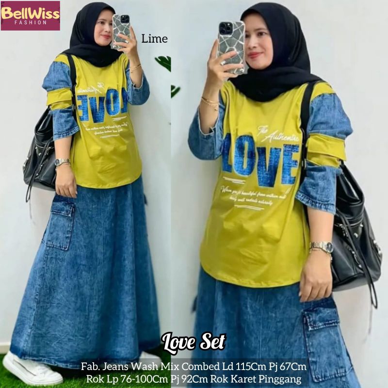 Love set / set rok Jeans wanita / set celana jeans dan kaos combat wanita / setelan terbaru wanita