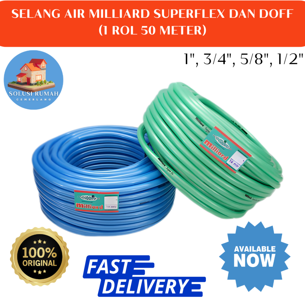 Selang Air 1 Roll 50 Meter Ukuran 1" 1/2" 5/8" Dan 3/4" Inch Milliard Superflex & Doff Selang Metalik Miliard