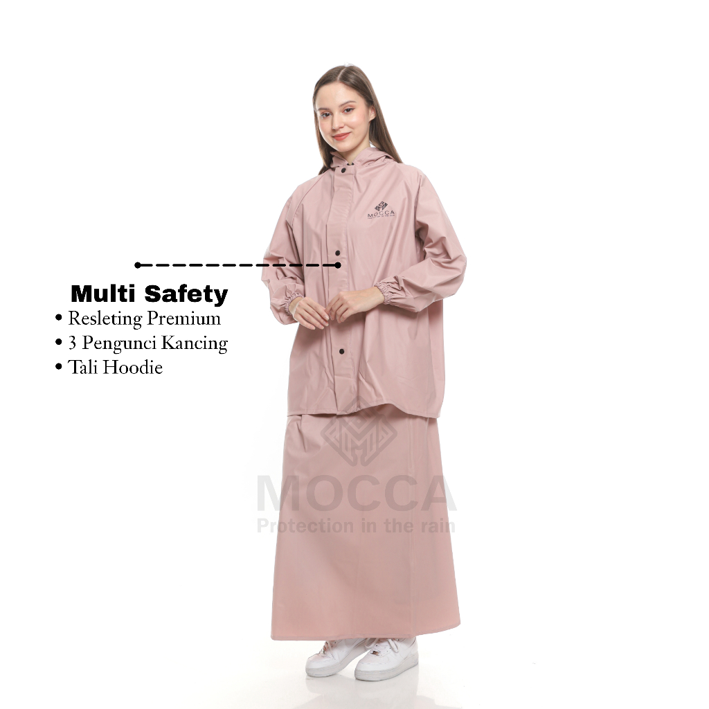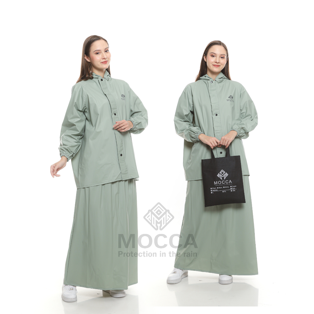 Jas Hujan RAINCOAT Setelan Rok Syar'i Wanita Mocca Muslimah Bahan PVC Tebal Lentur