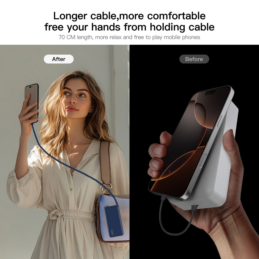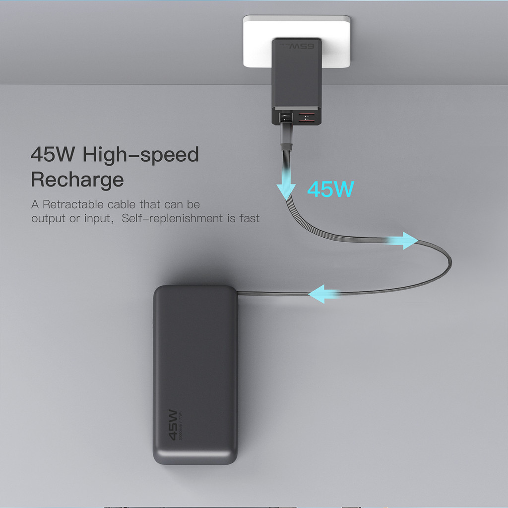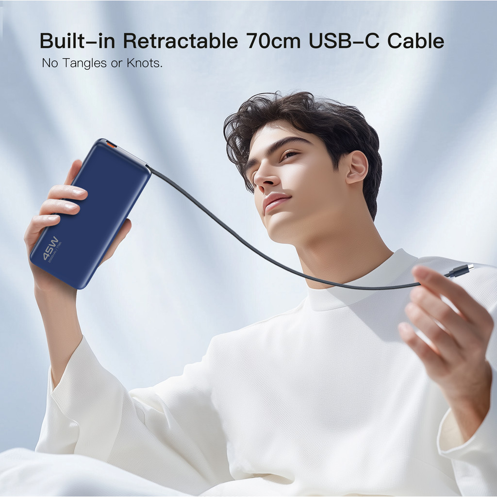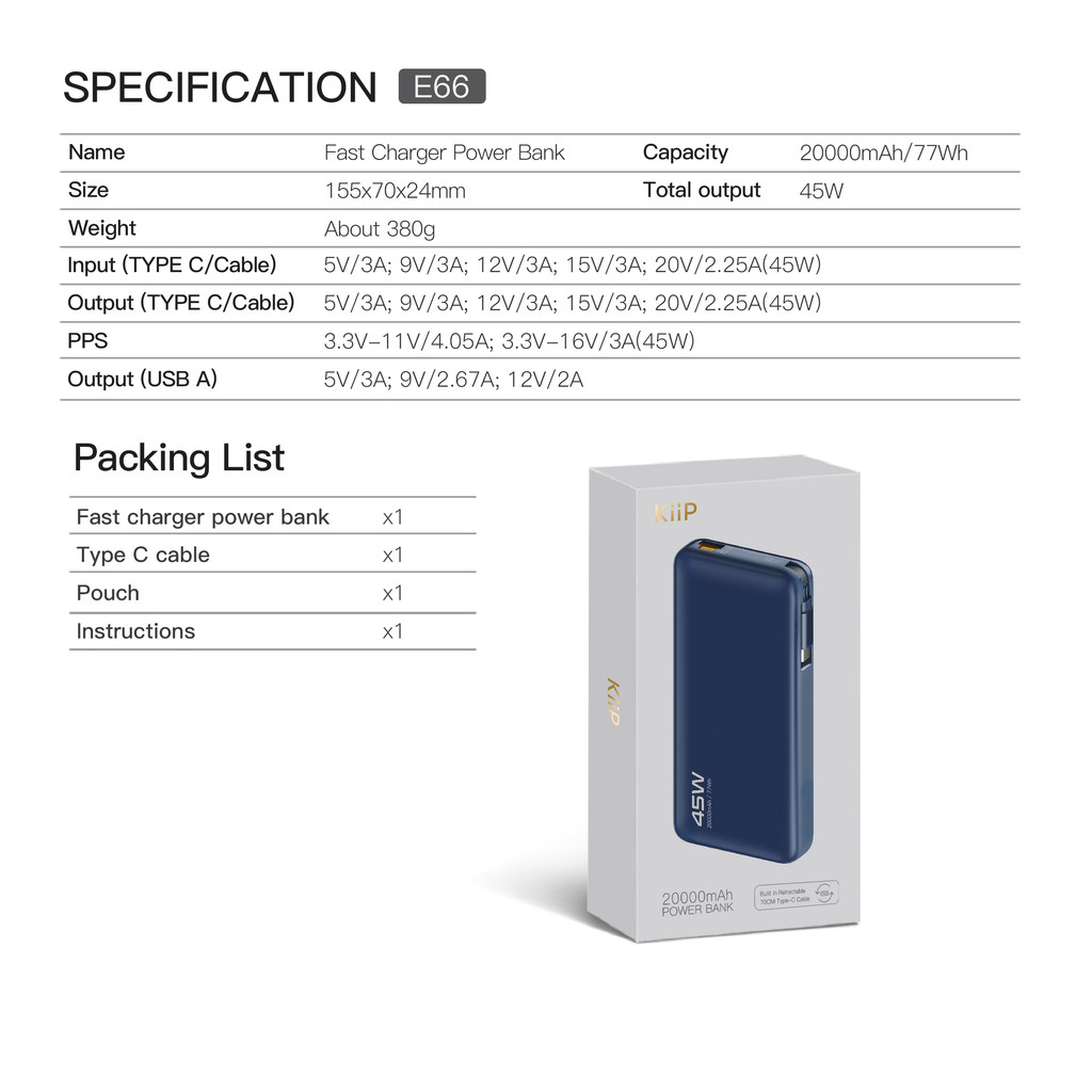 KiiP E66 PowerBank Retractable Cable 20000mAh PD QC PPS Fast Charging 45W