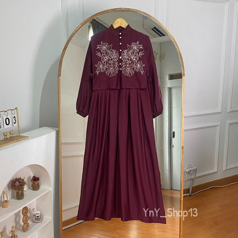 Gamis Angelina | Bahan Polo Linen Mix Bordir Premium | Busui Friendly | Ukuran S–XXL