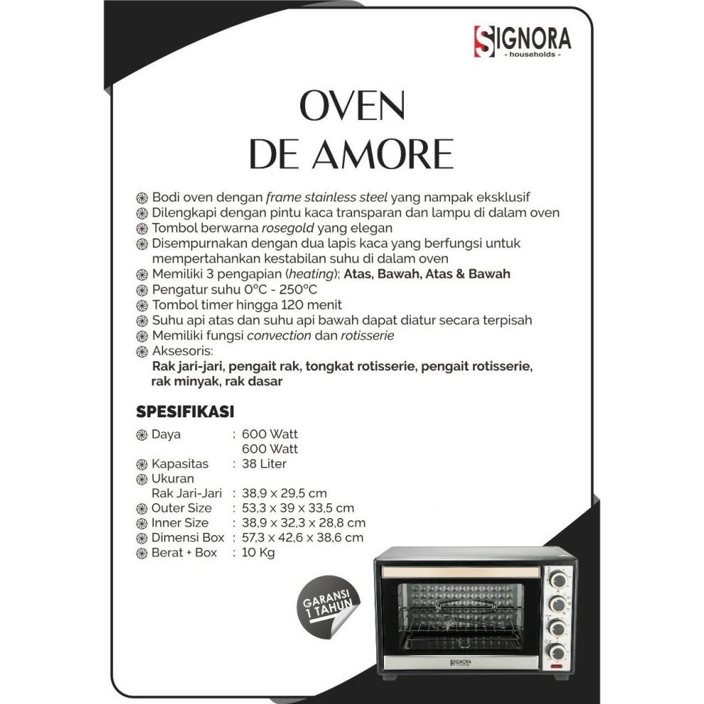Signora Oven De Amore Kapasitas 38 Liter Garansi Resmi Free Hadiah